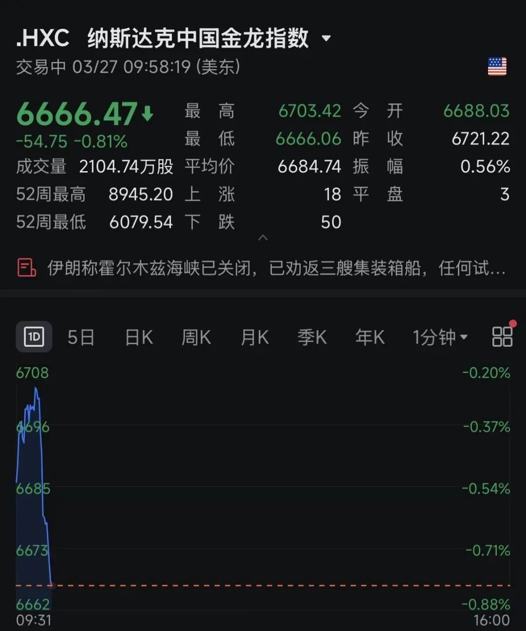 中概股方面,纳斯达克中国金龙指数直线走低,个股方面,小马智行跌超6%,金山云、文远知行跌超4%。
