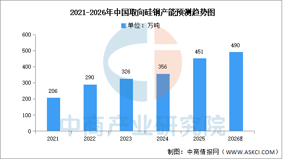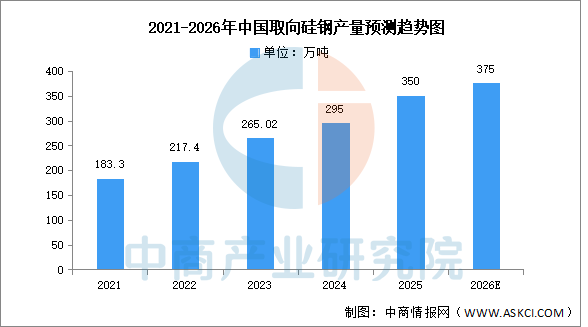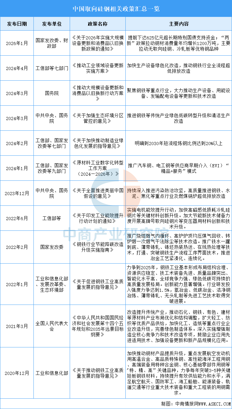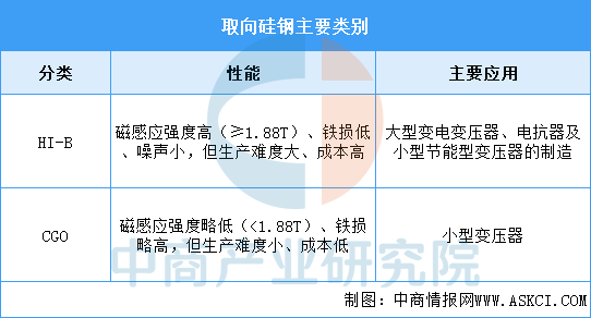 取向硅钢定义 取向硅钢也称冷轧变压器钢,是一种晶粒基本朝同一方向排列的极低碳硅铁合金材料。取向硅钢是变压器关键原材料,主要用于变压器(铁心)的制造,还可应用于大型电机(水电、风电)等领域。按制备工艺和磁性能,取向硅钢可分为普通取向硅(CGO,磁感<1.88T)和高磁感取向硅钢(Hi-B,磁感≥1.88T)。 资料来源:中商产业研究院整理 取向硅钢行业发展政策 取向硅钢的制造技术高度复杂、工艺窗口极为狭窄,且对成分的控制要求极为严格,因此代表了一个国家钢铁制造业的综合技术水平。为实现我国关键电力设备自主保障、避免受制于人,国家出台了一系列宏观调控政策,以产业升级和节能环保为重心,推动取向硅钢行业的健康、有序发展。 资料来源:中商产业研究院整理 取向硅钢行业发展现状 1.材料 中商产业研究院发布的《2025-2030年中国取向硅钢分析及发展趋势研究预测报告》显示,截至2024年底,取向硅钢产量占硅钢总产量的比例由2021年的13.7%提高到2024年的18.3%,达295万吨。2025年国内取向硅钢产量约350万吨。中商产业研究院分析师预测,2025年中国取向硅钢产量将达375万吨。 数据来源:中商产业研究院整理 2.产能 中商产业研究院发布的《2025-2030年中国取向硅钢分析及发展趋势研究预测报告》显示,截至2025年底,2025年中国取向硅钢产能约为451万吨,较2024年同比增长26.7%。中商产业研究院分析师预测,到2026年产能有望接近500万吨。 数据来源:SMM、中商产业研究院整理 3.产能结构 目前,投产的取向硅钢主要以HIB为主,占比达80%,主要受到下游需求刚性且集中于HIB等高附加值产品的影响。CGO产能占比达20%。 数据来源:SMM、中商产业研究院整理 4.重点企业分析 当前取向硅钢领域呈现“金字塔型”竞争格局,头部国企依托技术积淀主导高端市场,持续推动磁损优化与进口替代;民营企业则通过差异化定位抢占中端市场。全行业正加速向高磁感、低损耗技术迭代,应用场景从传统电力设备向新能源输电、智能电网等方向延伸,但基础材料工艺瓶颈与国际标准话语权仍是本土企业共同面临的挑战。 资料来源:中商产业研究院整理 取向硅钢行业重点企业 1.宝钢股份 宝山钢铁股份有限公司的主营业务是钢铁制造、加工配送、化工、信息科技、金融以及电子商务等业务。宝钢股份的主要产品是碳钢薄板、厚板与钢管等钢铁精品。 2025年前三季度实现营业收入2324.36亿元,同比下降4.29%;实现归母净利润79.59亿元,同比增长35.31%。2025年上半年主营产品包括冷轧碳钢板卷、热轧碳钢板卷,营收分别占整体的37.01%、20.60%。 数据来源:中商产业研究院整理 数据来源:中商产业研究院整理 2.首钢股份 北京首钢股份有限公司的主营业务是钢铁产品和金属软磁材料(电工钢)的生产和销售。首钢股份的主要产品是钢坯、热轧、冷轧、金属软磁材料。 2025年前三季度实现营业收入772.34亿元,同比下降5.78%;实现归母净利润9.53亿元,同比增长367.16%。2025年上半年主营产品包括冷轧、热轧、金属软磁材料,营收分别占整体的41.42%、39.28%、15.10%。 数据来源:中商产业研究院整理 数据来源:中商产业研究院整理 3.望变电气 重庆望变电气(集团)股份有限公司的主营业务是取向硅钢和输配电及控制设备的研发、生产与销售。望变电气的主要产品是电力变压器、箱式变电站、成套电气设备、铁芯相关产品、一般取向硅钢(CGO)、高磁感取向硅钢(HiB)。 2025年前三季度实现营业收入27.28亿元,同比增长14.91%;实现归母净利润0.81亿元,同比增长50%。2025年主营产品包括输配电及控制设备、取向硅钢,营收分别占整体的62.23%、34.65%。 数据来源:中商产业研究院整理 数据来源:中商产业研究院整理 4.包头威丰 包头市威丰稀土电磁材料股份有限公司是一家成立于2007年12月17日的股份有限公司,位于内蒙古包头稀土高新区。公司是国家级高新技术企业、专精特新“小巨人”企业,在西北地区和内蒙古较早建立了取向硅钢生产线,主营业务为高磁感取向硅钢的研发、生产与销售。 5.宁波银亿 宁波银亿的取向硅钢布局主要通过其全资子公司“宁波银亿科创新材料有限公司”展开。该公司自2016年起专注于取向硅钢的研发、生产和销售,建立了国内首条民营企业高磁感取向硅钢(Hi-B)生产线,产品覆盖0.3mm至0.18mm厚度,可应用于高压、特高压变压器领域,在民营企业中处于技术领先地位。为深化高端产品研发,银亿集团与安阳钢铁集团、安阳高新区政府及立德公司于2019年合资成立了“河南安银先导新材料科技公司”,共同攻关高磁感取向硅钢的“一贯制”生产工艺。根据2024年行业数据,宁波银亿在中国取向硅钢市场的份额约为4%,是行业内重要的民营企业参与者之一。取向硅钢行业发展前景 1.技术创新驱动性能提升 中国取向硅钢行业正持续投入研发,致力于突破高磁感、低铁损的核心技术瓶颈。通过优化化学成分、改进轧制与退火工艺,并探索薄规格、高强度等新型产品,行业不断提升产品的磁性能和机械性能。这种对技术创新的不懈追求,帮助行业满足电力设备日益严苛的能效要求,为制造更节能、更紧凑的变压器提供关键材料基础,从而巩固其在高端制造领域的核心竞争力。 2.下游电力投资稳定需求 国家在电网升级改造、特高压输电工程以及新能源电站接入等领域的持续投资,构成了对取向硅钢长期而稳定的需求基
