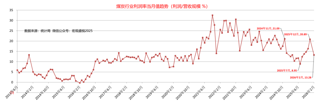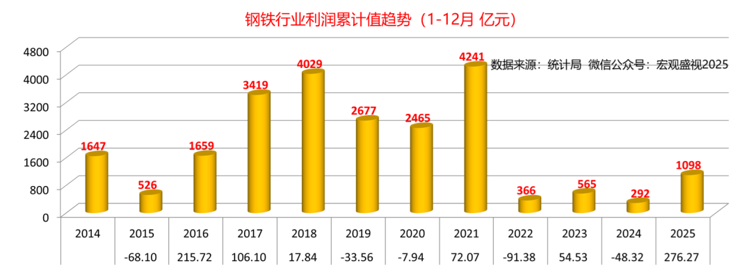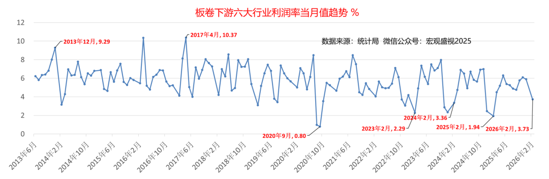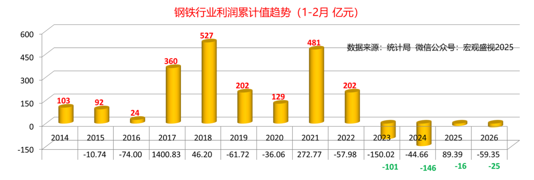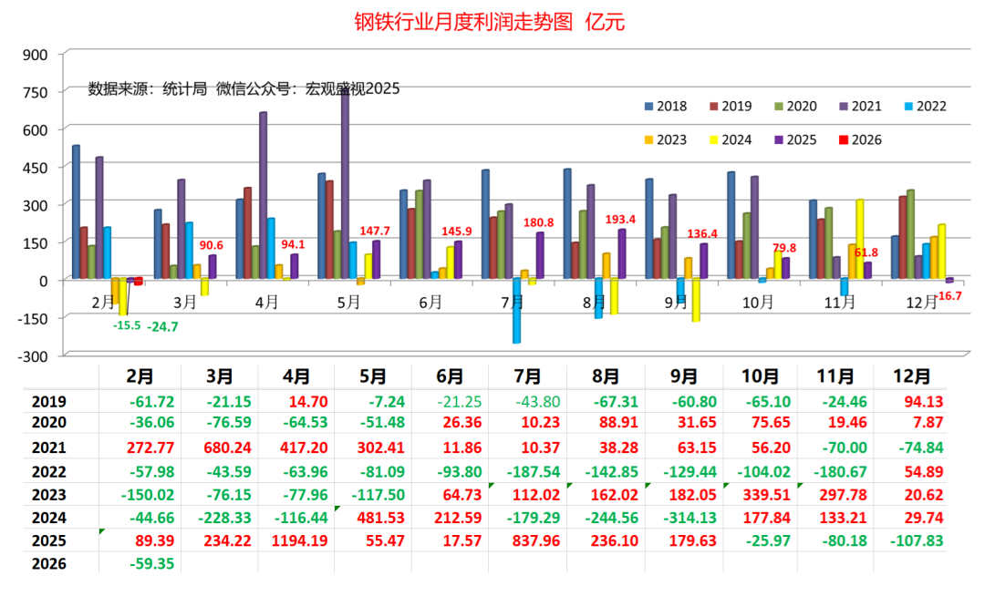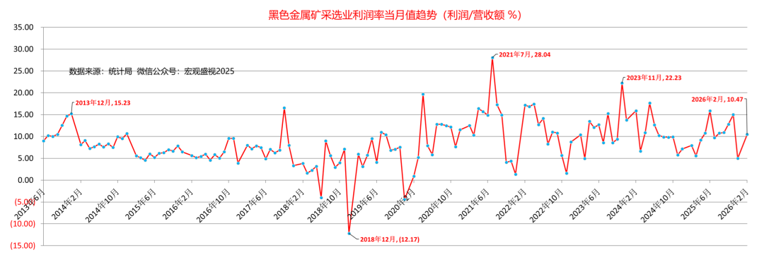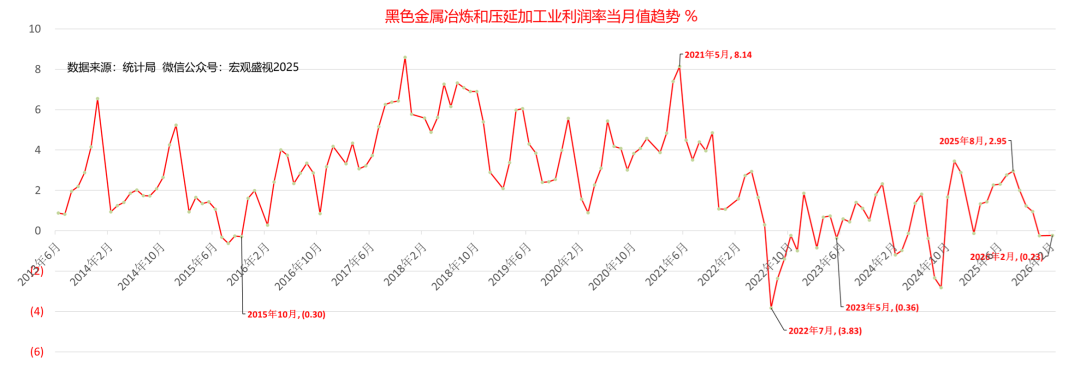 有人讲过,利润就像是乳沟,用力挤一挤,总会有一些。当然,原句不是讲利润,这里用来描述利润,其实似乎也并无不妥。需要说明的是,如果利润如果已经到了需要用力挤压才能有的地步,应该说明行业处境的艰难。潜在的话题,就有挤压取向的问题。向上游挤压,意味着原料成本价格需要得到下降,而如果是向下游挤压要利润,意味着要对下游提涨钢材产品的价格。今天的报告,虽然只是围绕钢铁行业利润展开,各位也可以对照各自所在的领域,看看你所在行业,利润趋势是个什么情况。统计数据显示(如下图),2026年1-2月份,国内钢铁行业利润累计值为-24.7亿元,同比增幅-59.35%。按照2026年1-2月份16034万吨粗钢计算,粗钢利润值-15.40元/吨,全行业重回全面亏损状态。考虑到利润同比下滑的情况,再考虑到吨粗钢的利润水平,初步对比之下(结合如下图),钢铁行业利润要达到2025年的水平,需要付出的努力还是蛮艰巨的。2026年接下去,钢铁行业如果要取得好转趋势,要么能对下游提涨钢材销售价格,要么能对上游压低原料(铁矿石 、煤焦及合金等)采购成本。带着这样的思路,一起来看今天的报告后续。2025年钢铁行业利润走势可见(如下图),钢铁行业实现了1098亿元的利润,行业利润在年初2月为负值-15.5亿元,其中全行业利润率高点,出现在2025年8月份攀升到最高点为193.4亿元,此后便一路下滑,年末12月利润值再回负值-16.7亿元。对应利润来看(如下图),2025年2月利润率值为-0.14%,8月份利润率当月值为2.95%,2025年12月份回落至-0.25%。至2026年月份,行业利润率-0.23%,连续三个月(2025年12月-2026年2月)处于利润率负值区间。对应2025年钢铁行业利润演变趋势,对应来看主要上游行业的情况可见:2025年钢铁行业利润一路走高的过程,恰与煤炭行业利润走低 、以及铁矿石利润从低位走高的过程叠加。煤炭行业统计数据可见(如下图),2024年11月-2025年7月份,煤炭行业利润率当月值,自21.09%一路下跌至8.95%。铁矿石板块的统计数据显示(如下图),2024年11月-2025年6月份,国内铁矿石开采行业利润率,自5.76%逐步攀升至15.89%。国内铁矿石开采行业的利润的高低,与矿石现货价格息息相关,其利润率高表征着国内铁矿石现货价高,反之则意味着价格处于低位。在尚未梳理钢材价格影响因素的情况下,老盛认为可以这样理解:2025年钢铁行业的利润,主要受益于煤炭价格的下跌,一定程度上,也得到铁矿石价格相对低位逐步上行的好处。因此,钢铁行业利润,在2025年上半年表现为上升趋势。其转折点来自于这样两个方面:一方面是由于伴随煤炭行业变化,自2025年7月份开始借助“反内卷”推涨煤价,煤炭行业利润在12月重回20.89%的历史同期最高位;另一方面则是来自铁矿石行业驱动,在6月份达到15.89%的高位后,至11月份依旧维持在15%的高利润水平。由此,钢铁行业利润,自2025年下半年伊始,便开始了下坡之路。调取2025年全年建筑用钢及制造业用钢代表钢价走势可见(如下两图):2025年制造业用钢价格趋势涨跌互现,自年出下跌至6月初,下跌幅度约460元/吨,反弹至7月底,上涨幅度约500元/吨,而后震荡下跌年底,最大下跌幅度约为350元/吨。2025年建筑用钢的价格趋势,自年出下跌至5月底,下跌幅度约450元/吨,反弹至7月份,上涨幅度约470元/吨,而后震荡下跌年底,最大下跌幅度约为380元/吨。这样的钢材现货价格走势,表明下游需求,并未强有力支撑起钢材价格的走势。价格的反弹,更多是基于资本市场技术面因素而为,而钢价的下跌,更多则是基于钢材现货供需基本面的回归所致。举例以制造业用钢的六大下游行业的利润情况来看(如下图),钢铁下游制造业的用钢利润支撑,总体也处于承压状态:六大行业的利润率,也总体处于下滑的态势中。板卷下游六大行业系指:金属制品业,通用设备制造业,专用设备制造业,汽车制造业,铁路、船舶、航空航天和其他运输设备制造业和电气机械和器材制造业。基于历史数据的梳理和对比,考虑到钢铁上下游行业的现状,老盛对钢铁行业2026年的利润情况,做出以下的预判供参考:其一 、从钢铁行业上游来看:一方面,国内反内卷的做法依旧,煤炭依旧会处于被炒作的前沿,叠加中东战争引发的能源价格波动,煤价在2026年会表现为下跌不易,尤其是在上半年,中东动荡若持续全年,能源价格的不确定始终会伴随。另一方面,高炉生铁的产量大幅度下滑尚未可见,进口铁矿石的第三极(澳大利亚与巴西以外,第三个进口量过亿吨的进口来源地)尚未形成,因此2026年铁矿石价格较大幅度的下跌,不易出现。即便下跌10%,也不足以支撑钢铁行业利润较大幅度改善。