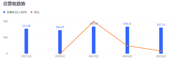 但昨天,百度发的二季度财报,我觉得依然值得拿出来跟大家说道说道。光看营收,其实百度这一季表现并不算太亮眼。总营收 327 亿元,同比下滑了 4% 。这已经是百度连续第二年季度收入下滑了,今年成了 2023 年后的最弱的一届。