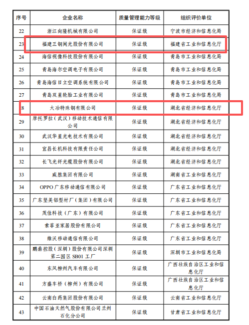 为落实《制造业卓越质量工程实施意见》(工信部联科〔2023〕249号)和《工业和信息化部办公厅关于开展2024年制造业企业质量管理能力评价工作的通知》(工信厅科函〔2024〕160号),经自评价、评价复核、二次复核、征求意见、社会公示,工业和信息化部办公厅确定了首批43家质量管理能力高等级企业名单。