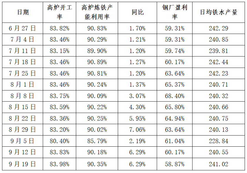 钢企生产情况 ▲高炉开工率:83.98%,环比上周增加0.15%,同比去年增加5.75%。 ▲日均铁水产量:241.02万吨,环比上周增加0.47万吨,同比去年增加17.19万吨。 ▲高炉炼铁产能利用率:90.35%,环比上周增加0.17%,同比去年增加6.29%。