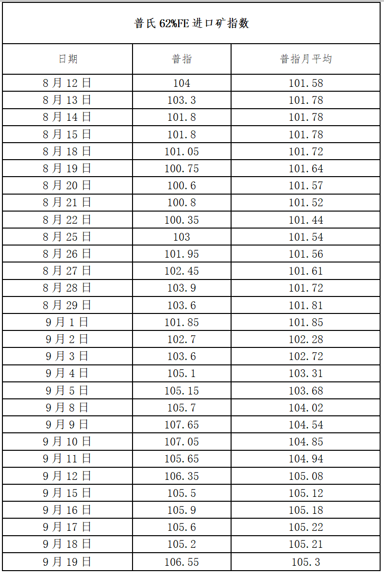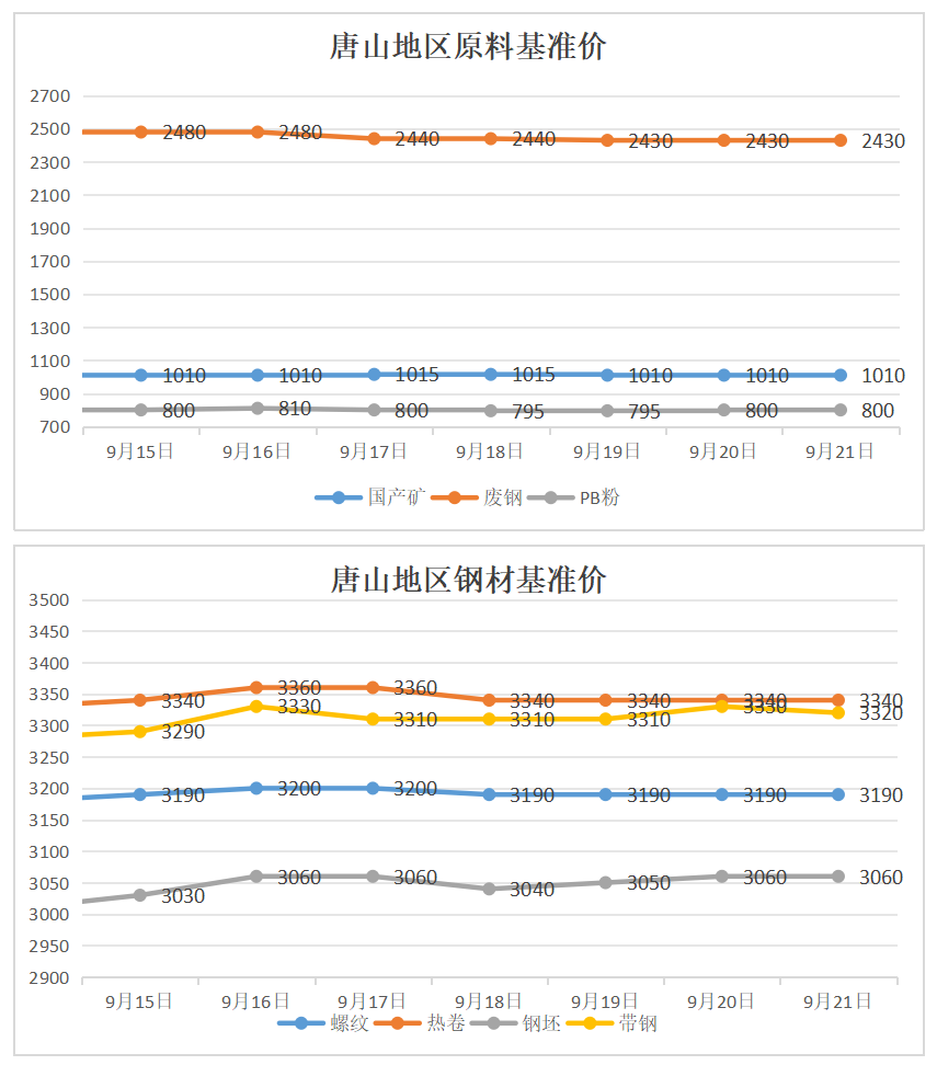 铁矿石最新数据 ▲ 到港总量:9月8日-9月14日中国47港铁矿石到港总量2392.3万吨,环比减少180.6万吨;中国45港铁矿石到港总量2362.3万吨,环比减少85.7万吨;北方六港铁矿石到港总量1245.0万吨,环比减少75.0万吨。 ▲ 发运总量:9月8日-9月14日全球铁矿石发运总量3573.1万吨,环比增加816.9万吨。澳洲巴西铁矿发运总量2977.8万吨,环比增加648.2万吨。澳洲发运量2084.6万吨,环比增加262.2万吨,其中澳洲发往中国的量1836.2万吨,环比增加304.9万吨。巴西发运量893.2万吨,环比增加386.0万吨。 ▲ 库存总量:本周全国45个港口进口铁矿库存总量13801.08万吨,环比下降48.39万吨;日均疏港量339.17万吨,增7.89万吨;在港船舶数量101条,增1条;全国47个港口进口铁矿库存总量14381.68万吨,环比下降74.44万吨;日均疏港量351.03万吨,增6.64万吨。 4 ● 数据汇总 1、唐山地区原料、钢材基准价(今日钢铁独家采集) 备注:1、数据来源为今日钢铁市场采集; 2、单位为元/吨。 2、大宗散货国际航线海运运费 备注:单位为美元/吨。 3、进口铁矿石普氏指数 备注:单位为美元/干吨 备注:单位为美元/干吨 4、国内调研247家钢厂生产情况 备注:1、日均铁水产量单位为万吨/天; 2、调研247家钢厂。 5、双焦汽运运费 备注:运费单位为元/吨。 6、吨焦盈利 备注:单位为元/吨。 7、全国钢材库存 备注:单位为万吨。 5 ● 市场分析 铁矿石