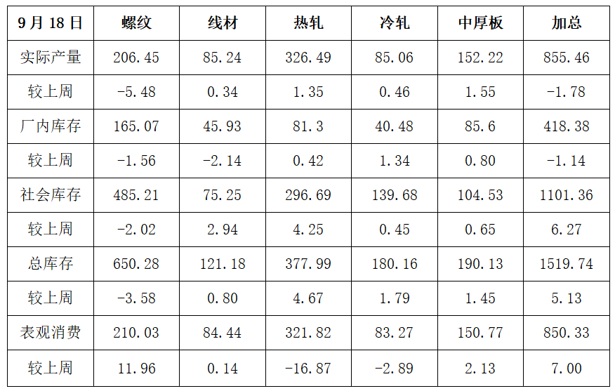 钢材市场供需 ▲ 供应量:五大钢材品种供应855.46万吨,周环比降1.78万吨,降幅为0.2%。 ▲ 库存量:五大钢材总库存1519.74万吨,周环比增5.13万吨,增幅0.3%。 ▲ 消费量:五大品种周消费量850.33万吨,其中建材消费环比增4.3%,板材消费环比降0.9%。