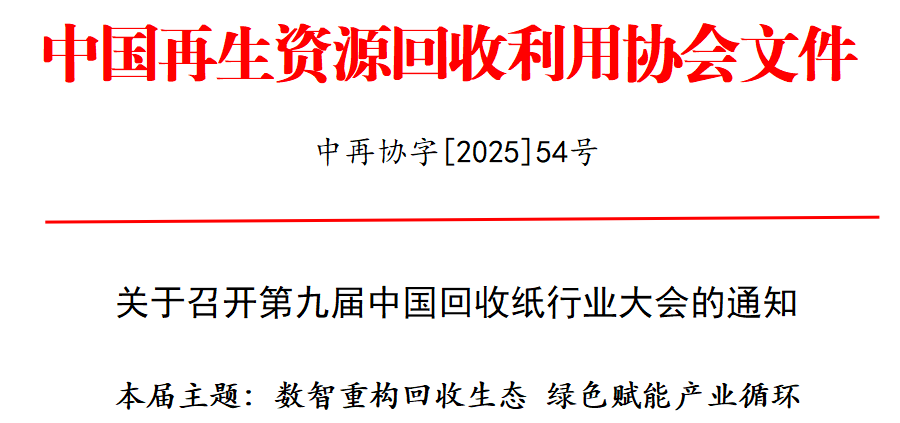 在全球可持续发展理念深入推进与我国生态文明建设加速升级的双重驱动下,回收纸行业正迎来政策赋能与产业变革的历史交汇期。2025 年国家 "两新" 政策加力扩围实施,明确将再生资源回收体系建设纳入重点支持领域,中央财政支持持续加码、“反向开票”全面推行,中央财经委对纵深推进全国统一大市场建设作出重大战略安排……一系列政策的精准出台为营造公平竞争环境、降低企业负担、提升运营效率提供了政策保障。另一方面,欧盟碳关税(CBAM)和《包装和包装废弃物法规》(PPWR)为出口企业可持续供应链管理提出了严峻挑战。为应对国际绿色贸易壁垒,2025年政府工作报告首次将“大力推广再生材料使用”列为重点工作任务,有关部门正在积极研究包括再生纸在内的主要再生材料推广使用制度设计。 在此政策背景下,中央和地方国企以及实力雄厚的民营资本纷纷下场布局回收体系,重塑行业发展格局。与此同时,以AI 智能分选、数字化管理为核心的数智技术正在重构回收生态,以区块链溯源为支撑的绿色赋能机制加速产业循环升级。新的回收体系将逐渐打破传统人工回收屏障,通过模式和技术创新,实现降本增效和价值提升。 为深入剖析回收体系面临的深刻变革,探讨回收纸行业“十五五”发展方向,凝聚发展共识,搭建合作桥梁,中国再生资源回收利用协会废纸分会将于2025年11月25日-27日在天津召开第九届中国回收纸行业大会,本届大会以“数智重构回收生态,绿色赋能产业循环”为主题,探讨如何通过数智化、绿色化重构回收体系,实现回收纸产业链价值共赢。同期召开中再生协会废纸分会三届四次理事会,现将主要内容通知如下: