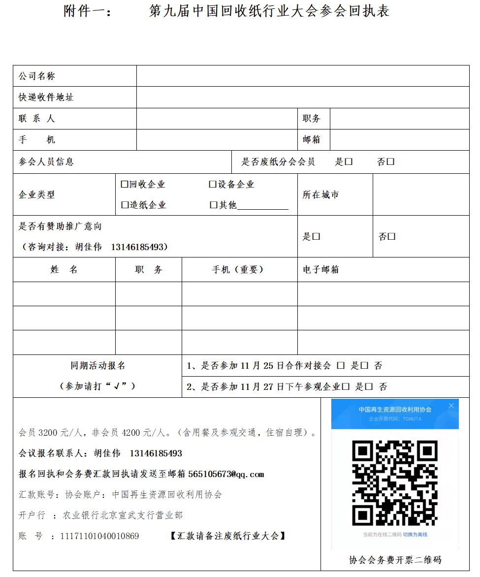 会议通知、议程详见中国再生资源回收利用协会官网和再生资源信息网及废纸信息网微信公众号。