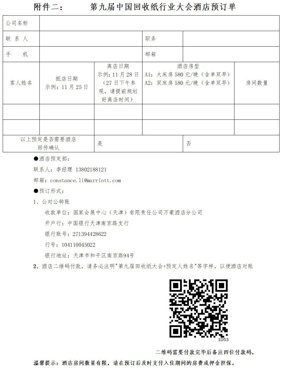 二、第九届中国回收纸行业大会酒店预订单