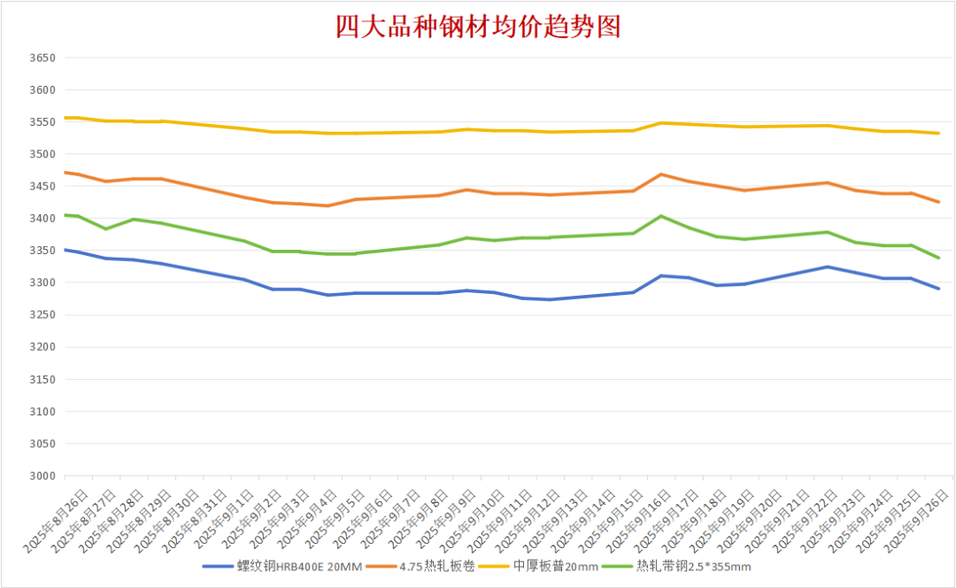 今日钢价走势 现货价格 建材市场:今日全国31个主要城市HRB400E20mm螺纹钢市场中,26个市场下跌,跌幅10-30元/吨;5个市场稳。均价达3290元/吨,下调16元/吨。 热卷市场:今日全国24个主要城市4.75热轧板卷市场中,19个市场下跌,跌幅10-20元/吨;5个市场稳。均价达3425元/吨,下调14元/吨。 带钢市场:今日全国12个主要城市2.5*355mm带钢市场中,11个市场下跌,跌幅10-40元/吨;1个市场稳。均价达3338元/吨,下调20元/吨。 中厚板市场:今日全国25个主要城市普20mm中厚板市场中,8个市场下跌,跌幅10元/吨;17个市场稳。均价达3532元/吨,下调4元/吨。 四大品类均价走势图 期货价格 品种 价格 涨跌幅 涨跌量 持仓量 螺纹2601 3114 -1.58% -50 197.65 热卷2601 3313 -1.22% -41 139.12 铁矿石2601 790 -1.74% -14 50.89 焦炭2601 1692.5 -2.79% -48.5 4.50 焦煤2601 1196.5 -2.64% -32.5 68.85 (单位:元/吨;万手) 影响钢价事件分析 1 中国炼焦行业协会严正声明 近期,我协会发现有不法分子假冒“中国炼焦行业协会”名义,通过伪造文件、虚假宣传等方式组织所谓“行业会议”,并散布“全行业限产”“联合提高焦炭销售价格”等不实信息。此类行为严重损害我协会声誉,扰乱市场秩序,涉嫌违法违规。现郑重声明如下: 1、中国炼焦行业协会从未发布或授权任何关于“强制限产”“联合提价”的通知或倡议。我协会始终严格遵守国家法律法规,坚决维护公平竞争的市场环境。 2、涉事机构及个人应立即停止侵权行为,我协会保留追究其法律责任的权利。 中国炼焦行业协会发布的辟谣消息澄清了不实传闻,有利于维护焦炭市场的正常秩序,消除了虚假限产提价信息对供给端的短期扰动。这使得钢价支撑因素回归实际供需基本面,对短期钢价影响偏中性。 2 关税再度来袭 墨西哥政府拟对中国等非自贸伙伴的产品提高进口关税税率的相关措施,具体涉及汽车及零部件、纺织品、服装、塑料、钢铁、家电、铝、玻璃等产品类别。商务部决定对墨西哥相关涉华限制措施启动贸易投资壁垒调查。 当地时间9月25日,美国总统特朗普在其社交媒体宣布,自10月1日起,美国将对多类进口产品实施新一轮高额关税。措施包括:对厨房橱柜、浴室洗手台及相关建材征收50%关税。 美墨新一轮关税措施将抑制我国钢材及相关制品出口,短期利空钢价,但可能倒逼国内政策加码内需对冲。若国内基建及制造业需求能有效承接,钢价或获支撑,但全球贸易摩擦升级风险仍存。 节前钢价预测 综合来看今日钢价整体走弱,期货市场全线下跌,双焦跌幅超过2%,现货市场普遍下调。墨西哥、美国新一轮关税措施对钢材出口形成压制,市场情绪偏空。当前供需基本面改善有限,节前补库接近尾声,成交趋于清淡。成本支撑与需求疲软继续博弈,若夜盘原料企稳,现货跌势或略有收窄。预计节前钢价延续窄幅震荡,幅度0-30元/吨。