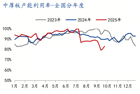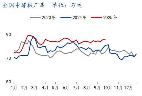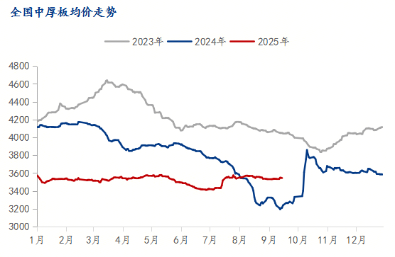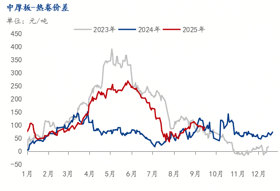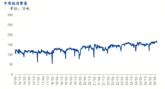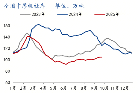 至9月26日,华北主要市场库存呈上升趋势,华东、中南地区库存也同样有所增加。加之“金九银十”旺季需求不及预期,流通环节去库速度缓慢,经销商为缓解资金压力可能采取降价销售策略,短期内对现货价格构成下行压力。 需求方面,终端需求复苏力度不足是核心矛盾。中厚板主要用于建筑、机械制造和船舶行业,这些领域的需求表现疲软。中厚板与热卷的价差已从年内高点的269元/吨大幅收窄至96元/吨,这一现象凸显出市场对中厚板的溢价偏好显著减弱,其下游需求强度明显低于应用于汽车、家电等领域的热卷。虽然宏观政策层面可能释放一些利好,但传统的“金九银十”销售旺季对需求的提振效果并未达到预期。若终端需求未能出现实质性改善,中厚板价格难以获得有效支撑。 综合来看,10月中厚板市场将面临流通环节库存攀升、供应压力因出口转内销而增大、以及终端需求复苏乏力的多重挑战。预计10月上旬价格仍存下行压力,中下旬后在成本支撑及部分阶段性需求释放下可能企稳甚至小幅反弹,但整体反弹空间有限,价格大概率维持在底部区间震荡。