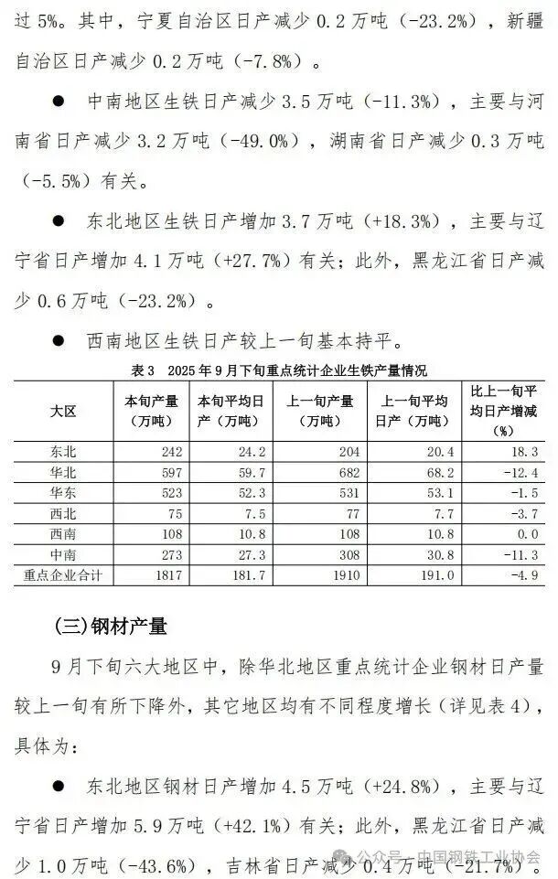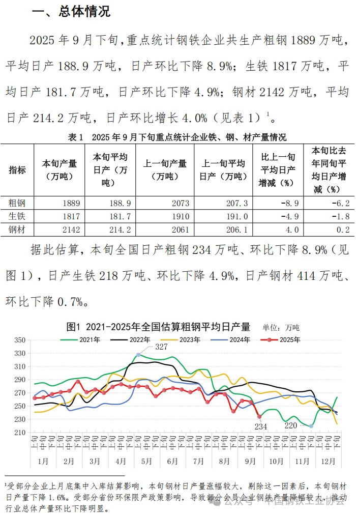 据中国钢铁工业协会统计数据显示,2025年9月下旬重点钢企生铁日均产量181.7万吨,旬环比下降4.9%,同比下降1.8%;9月下旬重点钢企粗钢日均产量188.9万吨,旬环比下降8.9%,同比下降6.2%;9月下旬重点钢企钢材日均产量214.2万吨,旬环比上升4.0%,同比上升0.2%。