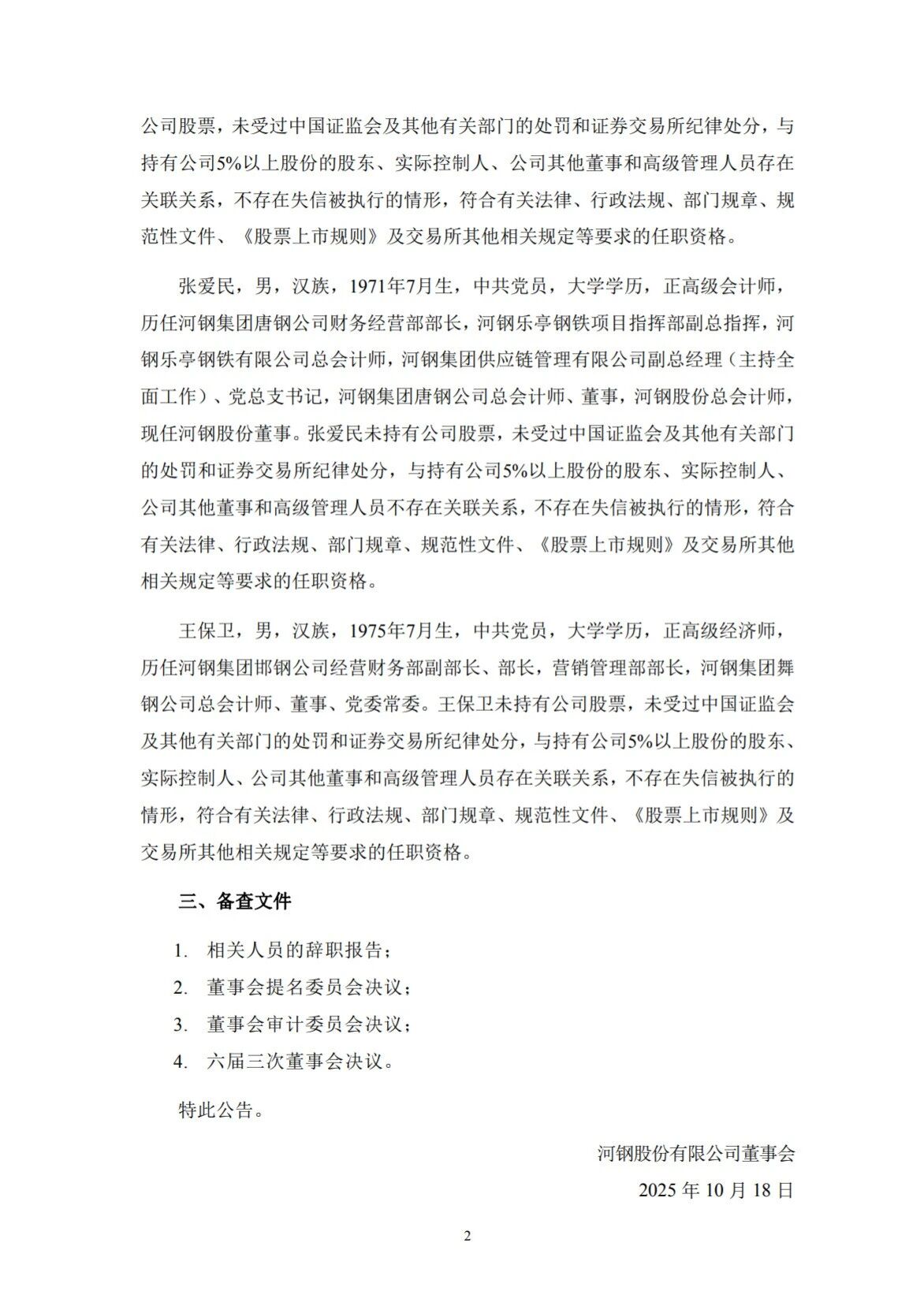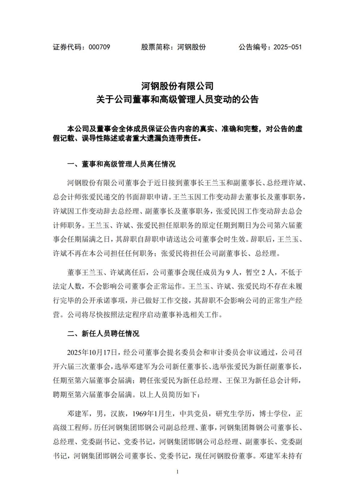 河钢股份有限公司董事会于近日接到董事长王兰玉和副董事长、总经理许斌、总会计师张爱民递交的书面辞职申请。王兰玉因工作变动辞去董事长及董事职务,许斌因工作变动辞去总经理、副董事长及董事职务,张爱民因工作变动辞去总会计师职务。王兰玉、许斌、张爱民担任原职务的原定任期到期日为公司第六届董事会任期届满之日,其辞职自辞职申请送达公司董事会时生效。 2025年10月17日,经公司董事会提名委员会和审计委员会审议通过,公司召开六届三次董事会,选举邓建军为公司新任董事长、选举张爱民为新任副董事长,任期至第六届董事会届满;聘任张爱民为新任总经理、王保卫为新任总会计师,聘期至第六届董事会届满。