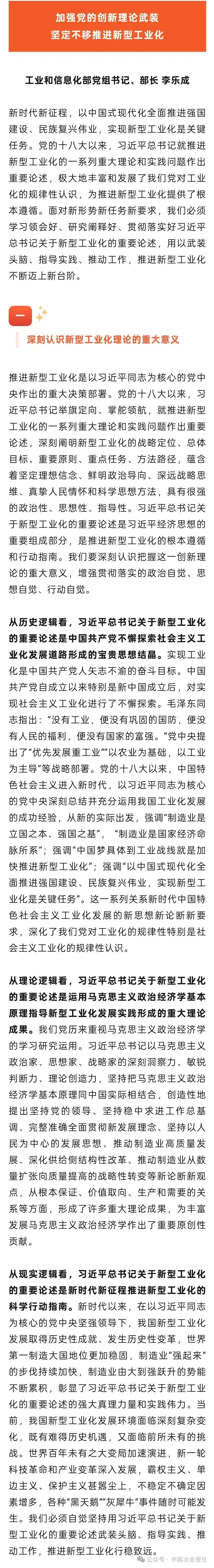近日,工业和信息化部党组书记、部长李乐成在《新型工业化》期刊上发表署名文章《加强党的创新理论武装 坚定不移推进新型工业化》。文中指出,现在我国工业生产规模已经很大,部分产品产量甚至超过了全球的60%、70%,同时随着我国人口增长拐点的出现,钢铁、水泥等产业规模已经达到峰值,传统“低价、走量”规模扩张模式已难以为继。必须坚持以优争先、以质取胜,提升制造业供给体系质量和效率,以高质量的供给创造和引领需求,不断拓展发展新空间。要顺应高端化智能化绿色化发展趋势,通过科技引领、数字赋能、质量筑基、文化铸魂、品牌增值,推动制造业由规模扩张重点转向价值创造,提高增加值率,向微笑曲线两端延伸,向价值链上游攀升,不断提高质量和效益。