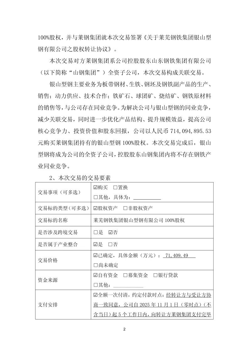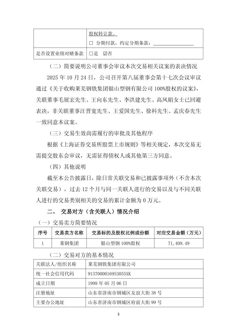 2025年10月24日,山东钢铁股份有限公司(以下简称“公司”或“股权受让方”)召开第八届董事会第十七次会议审议通过《关于收购莱芜钢铁集团银山型钢有限公司 100%股权的议案》,同意公司通过非公开协议转让方式以自有现金购买莱芜钢铁集团有限公司(以下简称“莱钢集团”或“股权转让方”)持有的莱芜钢铁集团银山型钢有限公司(以下简称“银山型钢”或“交易标的”或“目标公司”)100%股权,并与莱钢集团就本次交易签署《关于莱芜钢铁集团银山型钢有限公司之股权转让协议》。本次交易对方莱钢集团系公司控股股东山东钢铁集团有限公司(以下简称“山钢集团”)全资子公司,本次交易构成关联交易。
