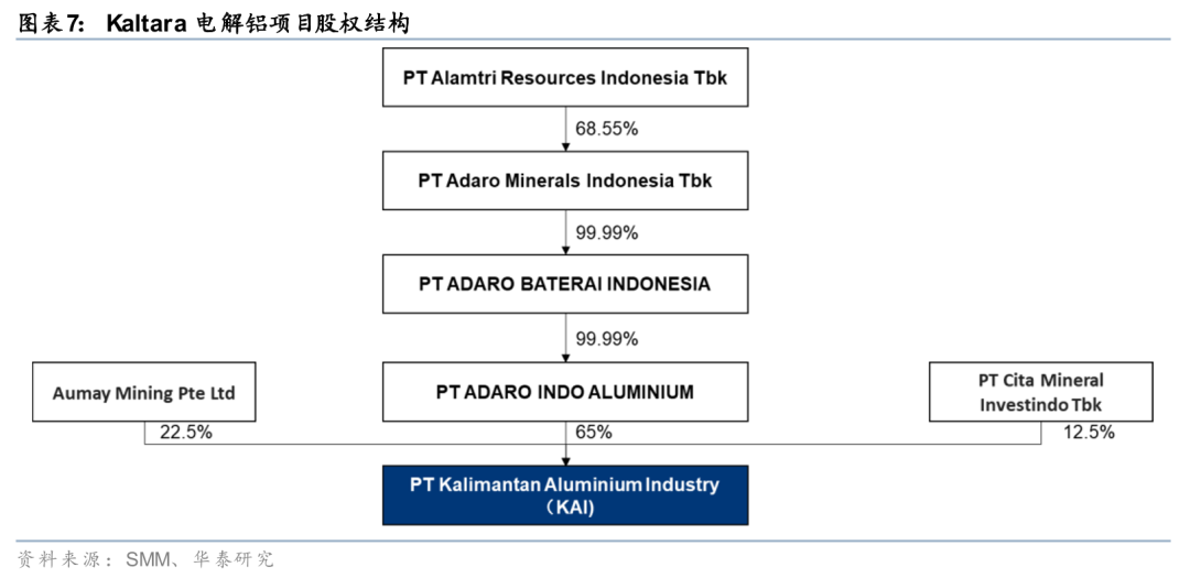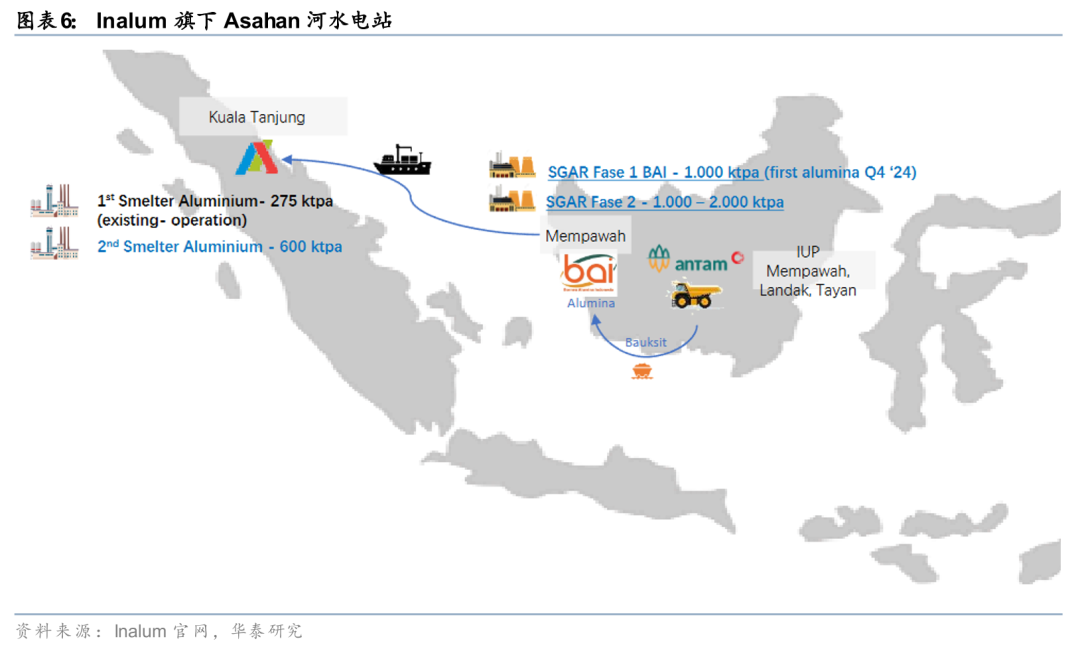 供给:26年全球电解铝供给增速或仅有1.9% 从全球电解铝供给来看,由于国内电解铝运行产能已逐步接近产能天花板,未来增量有限,因此对于全球供给的分析将聚焦于海外产能的建设、复产进度。 21-22年能源危机后欧洲电解铝减产产能至今未完全恢复,海外供给主要集中在中东、印度等地。受俄乌冲突影响,21-22年两年内欧洲电价(含税)大幅上涨63.8%,受此影响欧洲电解铝运行产能在22年开始大幅压减,根据CRU统计,2022年欧洲电解铝总产量为750.8万吨,同比下降7.96%;而截至2024年,欧洲电解铝总产量为740.0万吨,较21年产量815.7万吨相比仍未恢复至正常水平。其他地区方面,美国受电力供应紧张及设备老化原因,电解铝产量自2020年后连续五年下降,其中22-24年同比分别下降3.7%/10.7%/13.8%。增量方面,中东与印度成为增产主力,2024年分别新增13.7万吨/8.3万吨产量,2021年来产量保持正增长,21-24年CAGR分别为2.25%/2.08%。 展望未来,海外电解铝供给端的增长将集中于印尼等地区的新增产能投放,以及欧美地区此前减产产能的复产能力。印尼为未来全球原铝产能增量的核心来源,截止2025年10月,印尼电解铝产能规划总规模超过600万吨,根据投产节奏,我们预计至2027年新增近200万吨产量;此外欧美地区仍有部分项目处于待复产状态,这部分项目同样是未来供给增长的潜在贡献点。然而这两类产能的释放均存在现实制约,印尼能源转型背景下新建燃煤电厂受限,且在较低基础设施水平硬约束下,产能落地存在不确定性;欧美地区因能源成本高企和电力供应紧张,复产进度预计依旧较为缓慢。 印尼:未来全球电解铝增长主要贡献者,28年原铝产量或达300万吨以上 印尼已成为全球电解铝增量的主要贡献者。据CRU数据,截至2025年10月,印尼运行产能为 77.5 万吨/年,在建产能为 212.5 万吨,总规划产能达到 660 万吨,2025 年将有新增年产能约75万吨投产。从产量来看, 2024 年印尼电解铝总产量为 50.6 万吨,同比增长 26.9%,占全球总产量的 1.7%。我们预计2025–2028 年印尼电解铝产量将分别达到 81.5 万吨、150 万吨、250 万吨和 320 万吨,同期产量CAGR为 57.8%。预计到 2028 年,印尼产量占全球电解铝总产量的比例将提升至 9.1%。 根据我们的评估,印尼当前在建项目落地概率较高,但仍处于远期规划的项目落地面临较大挑战。 (1)华峰&青山Huachin电解铝厂 华青铝业全称PT Hua Chin Aluminum Indonesia,位于青山印尼苏拉威西岛莫罗瓦利工业园区(IMIP),根据SMM,该项目由华峰集团(Huafon Group Co., Ltd.)与青山控股集团(Tsingshan Holding Group)合资设立,两者分别持有其65%和35%股权。 50万吨产能已分两期投产,采用自备燃煤火电,短期暂无扩张计划。根据SMM,该项目首个25万吨产能于2021年9月开工建设,于2023年投产,另外25万吨产能曾因成本问题于2024年11月暂停投产,截止2025年10月已实现满产,总规模达50万吨;电力供应方面,根据SMM,项目采用自备燃煤火电,来自青山IMIP园区内自备燃煤机组。 2)印尼Kuala Tanjung电解铝厂 Kuala Tanjung电解铝厂位于印尼苏门答腊岛北部Batu Bara工业区,为印尼国有企业PT Mineral Industry Indonesia(Persero)(MINDID)旗下Inalum全资控股的项目。 KualaTanjung电解铝厂目前运行产能为27.5万吨/年,预计于2026年升至30万吨/年。产能规划方面,根据SMM,公司此前与EGA合作的40万吨产能扩建计划已终止。根据公司公布的新规划,Inalum拟在2028年完成Kuala Tanjung二期60万吨扩建,将总产能提升至90万吨/年;远期计划在西加里曼丹省Mempawah新建年产60万吨电解铝厂,合计产能达150万吨。在原料方面,据公司公告,目前公司通过在Inalum与Antam合资的Mempawah氧化铝厂对来自Antam矿区的铝土矿进行加工,随后将氧化铝通过西加里曼丹的港口运往Kuala Tanjung电解铝厂。 Inalum采用自备水电模式,一期电力小幅冗余,二期60万吨扩建预计2028年后落地,电力合同暂未解决。Inalum旗下两座水电站—Siguragura与Tangga总装机603MW,根据公司公告,2024年Kuala Tanjung电解铝厂原铝产量为27.4万吨,且仍有部分电力外售,考虑到公司后续拟更新发电设备,我们预计Inalum新增2.5万吨产能将如期投产。根据公司公告,二期Kuala Tanjung的60万吨扩建项目需新增约1008MW电力,并优先采用绿电方案,目标电价为0.05美元/千瓦时,目前电力解决方案尚未确定。 (3)Adaro/ CITA/力勤Kaltara项目(KAI) Kaltara项目(简称KAI)位于北加里曼丹工业园(KIPI),由Adaro Minerals旗下PT Kalimantan Aluminium Industry持有65%股权并控制,力勤通过旗下Aumay公司与Harita集团旗下CITA公司则分别持股22.5%和12.5%。 Kaltara一期50万吨产使用自备燃煤电,三期50万吨转向水电,二期电力来源尚未明确。根据SMM,Adaro旗下KAI项目总体规划年产150万吨铝,分三期建设,每期产能50万吨,预计一期2025年年底投产,二期2026年第四季度投产,三期计划在2029年第四季度建成。在电力供应方面,一期配套由KPI建设的4座燃煤电厂,总装机1060MW,预计2025年第四季度至2026年第一季度投运,按吨铝耗电13500kwh和每年发电时长6000-7000小时计算,每年可满足约51万吨产能的用电需求。根据公司公告,二期电力原计划使用煤电+绿电混合供电,但当前具体电源尚未明确,落地情况有待观察。而三期则计划转向水电,由Adaro持股50%的KHN公司开发Mentarang Induk水电站,装机规模1375MW,预计2026年第一季度完成融资,2029年下半年并网,2030年商业运行。 (4)南山Bintan项目 (BAI) PT Bintan Electrolytic Aluminium(简称BAI)项目位于印尼廖内群岛宾坦工业园,由