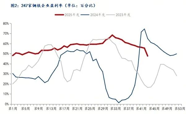 从市场基本面看,供需两端的失衡持续加剧。9月上旬全国21个城市五大品种钢材库存攀升至920万吨,同比增幅4.1%,库存压力已连续三个月高于去年同期。需求端则受房地产低迷拖累,1-8月房地产开发投资同比下降12.9%,钢材终端消费 旺季不旺成为常态。即便如此,钢厂主动减产的动力依然不足。截至10月27日 Mysteel调研247家钢厂高炉开工率84.71%,环比上周增加0.44个百分点,同比去年增加2.57个百分点 。高炉炼铁产能利用率89.94%,环比上周减少0.39个百分点 ,同比去年增加1.46个百分点;钢厂盈利率47.62%,环比上周减少7.79个百分点,同比去年减少17.32个百分点;日均铁水产量239.9万吨,环比上周减少1.05万吨,同比去年增加4.21万吨。 盈利钢企平均吨钢利润较 8 月下降 18.3%,二季度以来的盈利高峰已逐步消退。其中,头部钢企凭借前期低价原料锁定、高端钢材产品结构优势,盈利韧性相对较强,但也面临订单增速放缓的压力。中小钢厂则因以螺纹钢等普通建材为主,深陷“订单不足 - 降价抢单 - 利润收窄”的恶性循环,部分中小普钢企业的螺纹钢业务吨钢利润已跌破 30 元,较二季度峰值缩水超 80%,虽未亏损却已逼近盈利临界点。