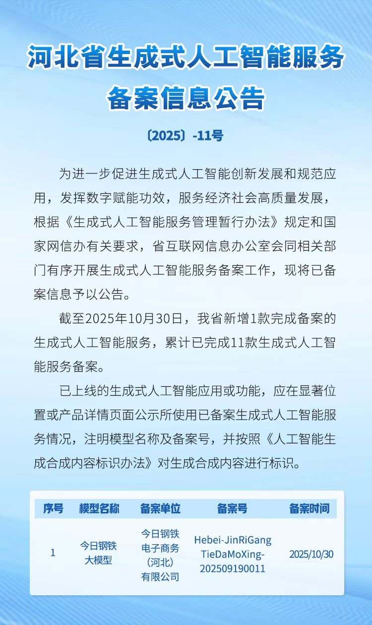 今日钢铁大模型是今日钢铁电子商务(河北)有限公司专门为钢铁行业设计和开发的人工智能大模型,通过智能化手段解决钢铁行业在生产、研发、管理等多方面遇到的问题。大模型不仅能够处理和分析大量的行业数据,还能提供专业化的知识查询和问答服务,覆盖价格行情、市场分析、烧结技术、炼铁技术、炼钢技术、轧钢技术等多个方面。 未来,今日钢铁将持续深耕技术研发,不断完善大模型在数据洞察、知识服务与智能决策等方面的能力,以更稳定、更高效、更专业的数字工具,助力钢铁行业提升运营效率、优化生产流程、激发创新活力,为推动钢铁产业迈向数字化、智能化新阶段贡献今日钢铁的智慧与力量。