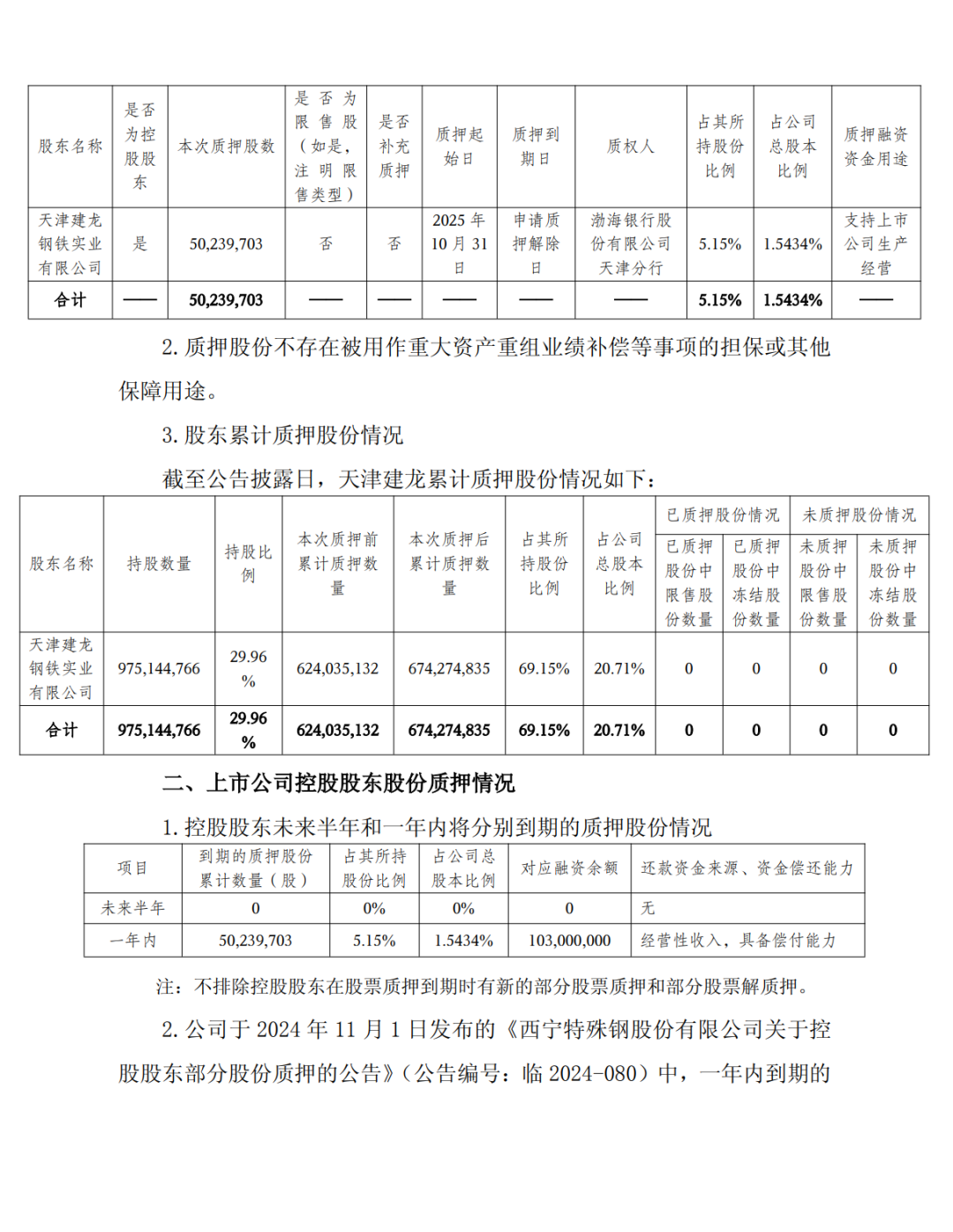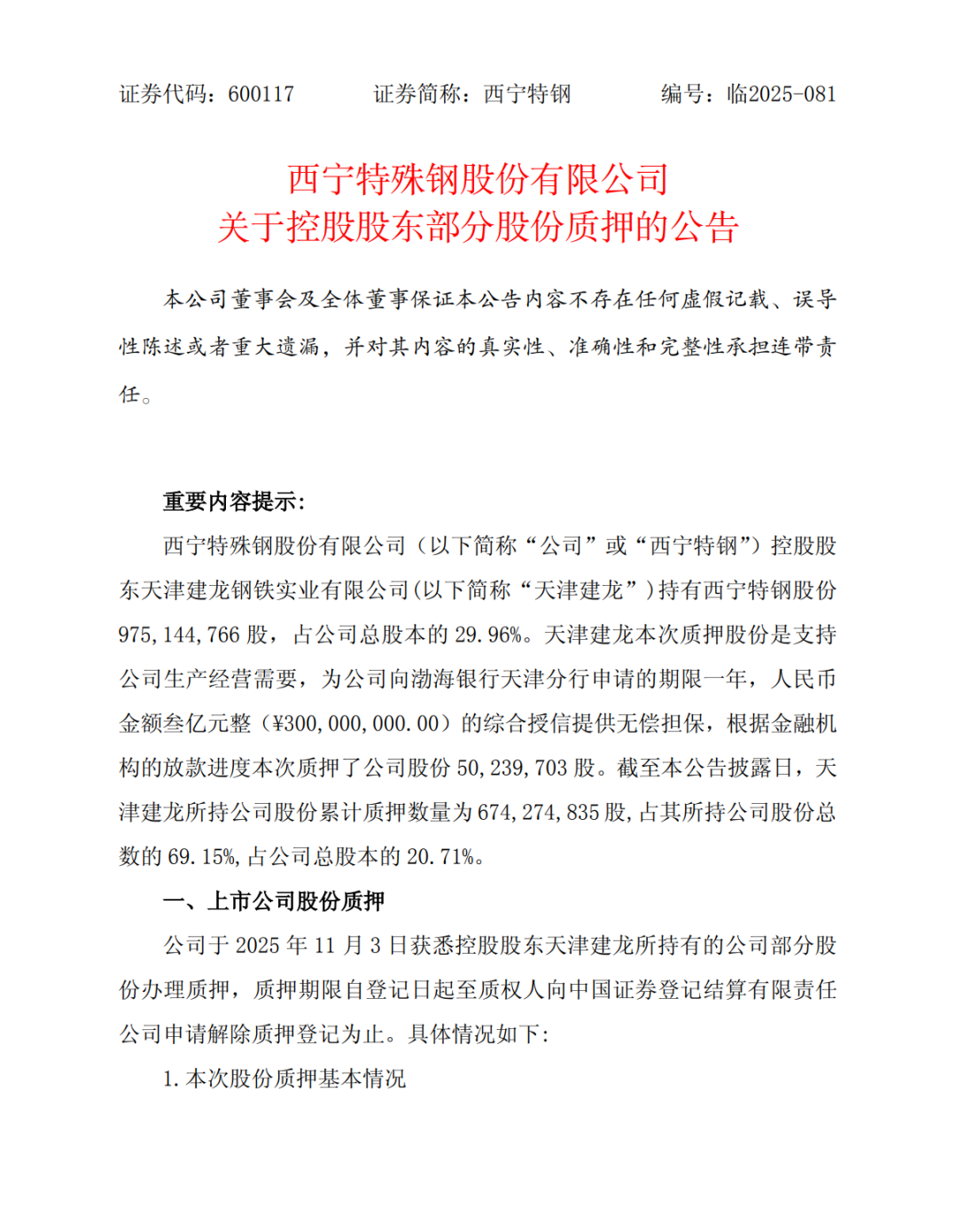 西宁特殊钢股份有限公司(以下简称“公司”或“西宁特钢”)控股股东天津建龙钢铁实业有限公司(以下简称“天津建龙”)持有西宁特钢股份975,144,766股,占公司总股本的29.96%。天津建龙本次质押股份是支持公司生产经营需要,为公司向渤海银行天津分行申请的期限一年,人民币金额叁亿元整(¥300,000,000.00)的综合授信提供无偿担保,根据金融机构的放款进度本次质押了公司股份50,239,703股。截至本公告披露日,天津建龙所持公司股份累计质押数量为674,274,835股,占其所持公司股份总数的69.15%,占公司总股本的 20.71%。
