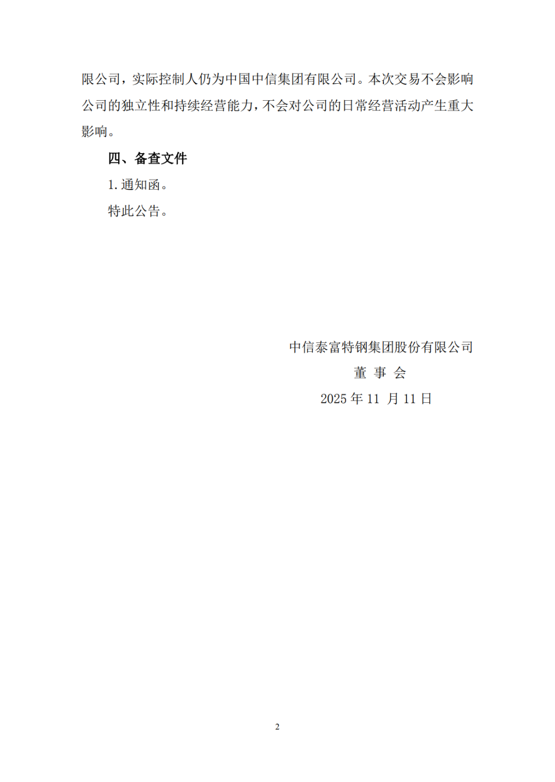 2025年11月7日,公司收到中信泰富通知,前述股权回购已完成,万富投资不再间接持有中信泰富特钢集团股份有限公司股权。