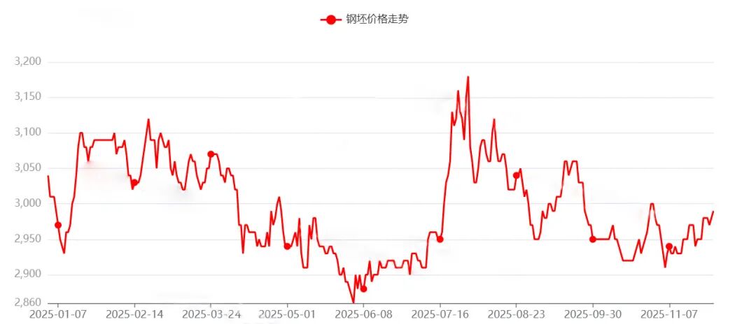 1 2025年以来钢坯价格走势情况 进入2025年以来,钢价在1月初出现下滑,跌至2930元/吨的低点,受利好消息影响,月内最高点攀升至3100元/吨,随后“金三银四”中受特朗普关税影响,钢价持续震荡,6月跌至年内低点2860元/吨。7月反内卷消息持续发力,铁矿石价格站上100美元关口,原料端持续走强,钢价一飞冲天,涨至年内最高点3180元/吨。随着消息持续消化,价格回归基本面,钢价持续震荡行情,“金九银十”希望破灭,11月钢价震荡探涨,但需求淡季已然来临,原料端价格开启下跌模式,供应端虽有收缩,但难抵需求减量。叠加政策真空期,价格保持震荡盘整态势。 2 12月钢价预测 据最新数据显示,11月份钢铁行业PMI为48%,环比下降1.2个百分点,行业运行有所放缓。下面从供应端、需求端、成本端及消息端,对12月钢价进行预判。 供应端: 随着北方采暖季环保限产政策深化,邯郸市、长沙市、川渝地区、临汾市等地均于11月发布了秋冬季大气污染防治相关政策文件,预计12月部分钢厂高炉、转炉停产限产比例或有增加,同时钢厂利润不佳,最新数据显示仅35%钢厂盈利,且随着天气转冷,需求疲软,在大面积亏损下,钢厂或有减产意愿,预计供给端会有所收缩。 需求端: 12月淡季表现显著,预计钢铁需求或将稳中有降。支撑需求仍在,比如基建项目进入年度冲刺、抢工期的关键阶段,预计建筑需求尚有一定韧性,但也要看到房地产数据不佳,也在拖累建筑用钢需求。1-10月房地产新开工面积同比下降14.7%,房屋新开工面积下降9.8%,房地产开发企业到位资金同比下降9.7%,一方面资金链紧张,另一方面受低温天气影响,停工范围再度扩大。 制造用钢方面“以旧换新”等政策仍在发力,年末补库需求仍在,对板材需求有一定支撑;出口方面,前三季度,我国累计出口钢材8796万吨,同比增长9.2%;累计出口金额613亿美元,同比下降1.2%。同时随着海外工业化建设,钢材需求或有所增加。整体来看,预计12月需求端或稳中有降。 成本端: 铁矿石方面,港口库存持续处于高位,但钢厂日产铁水产量却连续6周处于240万吨以下,钢厂采购节奏放缓,铁矿石价格预计震荡偏弱运行。 焦炭方面,在经历了几轮提涨后,价格将于12月1日迎来首轮提降,焦炭价格下降对钢价支撑减弱。 废钢方面,电炉钢厂利润持续不佳,开工率下降,钢厂采购意愿不强,需求疲软。 钢厂供应收缩,原料采购需求也持续偏弱,整体看预计炼钢成本趋弱,对钢价支撑也随之减弱。 消息端: 宏观消息上持续关注美联储降息,据CME“美联储观察”:美联储12月降息25个基点的概率为86.4%,维持利率不变的概率为13.6%。美联储到明年1月累计降息25个基点的概率为67.1%,维持利率不变的概率为10%,累计降息50个基点的概率为23%。 12月需关注中央经济工作会议,按照惯例,每年12月重要会议将相继召开,确定来年经济工作基调和风向。 最后一个月,仍要关注政策端反内卷是否实质性发力,还要关注中美关系。 3 综合观点 站在年末关口,12月钢市预计将呈现“供需两弱、成本下移”的复杂格局。北方采暖季限产和持续亏损正促使钢厂温和减产,供给端有所收缩,但需求面难有亮眼表现——基建年末赶工与制造业政策支撑仅能托底,难以抵消房地产低迷与严寒天气带来的需求萎缩。同时,铁矿石、焦炭等原料价格走弱,使得成本支撑松动。 综合来看,钢材价格大概率延续震荡态势,下行空间受供给收缩制约,上行则受需求淡季压制,部分品种或小幅回升,但难有趋势性行情。市场关注的焦点将转向12月重要会议能否释放超预期的政策信号,这或将成为打破当前僵局的关键变量。