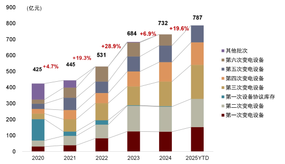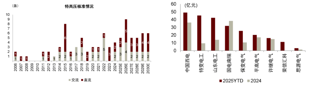 电网:“十五五”景气度延续。我们预计“十五五”期间全国电网工程投资额年均增速有望达5%以上,看好1)特高压建设有望在风光大基地及水电外送需求下保持高强度,2)主网投资维持高位;3)配网投资长期看好智能化升级改造方向。 工控:整体需求稳健,仍然看好结构性增长的市场机会。从需求与库存来看,市场整体呈现温和回暖;今年以来储能等新能源行业相关需求高增带动OEM反弹,展望明年我们认为结构性增长仍然为当前市场的主要驱动力。 AIDC:看好强弱侧电源等高斜率方向。强电侧,功率密度升级驱动800V直流供电方案趋势明确,我们看好HVDC/巴拿马电源/SST渗透率有望逐步提升,关注兼具技术+渠道的头部厂商布局进展。弱电侧,我们看好服务器电源持续升级迭代有望大幅提升产品ASP,电源厂商有望持续受益于Power Rack的迭代变化。 出海:把握全球电力大周期下电力设备出口机遇。我们认为,在负荷增长、煤电/核电退役、风光占比提升的大背景下,全球多地区缺电风险抬升,全球迎来电力投资大周期。今年以来中国变压器出口高增,我们持续看好中国电力设备企业海外布局加码,盈利弹性释放;燃气轮机、SOFC产业链迎来出海突破机遇。 风险 电网投资不及预期;宏观经济波动;新兴行业发展节奏不及预期;国际贸易政策变化和汇率波动风险。 电网:“十五五”电网投资景气度持续 总体投资:景气持续向上,投资创新高 国内电网投资景气度持续向上,两网投资创新高。根据国家能源局,2025年1-10月全国电网工程完成投资4824亿元,同比增长7.2%。根据两网2025年工作会议,国家电网预计全年投资首次超过6500亿元,南方电网固定资产投资安排1750亿元,再创历史新高。我们预计“十四五”期间,全国电网工程投资额约2.8万亿元,年均投资额约5500亿元。 电网是新能源投资的后周期,但短板仍未补齐。我们认为未来新能源发展步伐依然坚定,由重规模转向重消纳;电网是新能源发展的后周期,加快建设智能电网有利于进一步提高电网对清洁能源的接纳、配置和调控能力。在经历了2023-2025年的新能源快速发展时期,面向未来新能源的发展目标,我们认为我国电网仍然有较大的投资缺口需要补齐。 图表1:2025-2030年全国电网投资规模预测 资料来源:国家能源局,中金公司研究部 电网各环节全年回顾及展望 特高压:“十五五”建设强度有望保持 下半年特高压明显提速,看好年底起有望迎来新一轮设备招标高峰。截至12月10日,今年共核准特高压“两直三交”(山东烟威、藏东南-粤港澳、蒙西-京津冀、攀西、浙江环网),且于近期核准湘黔等五条直流背靠背工程,我们认为上半年进度较慢主要受送受端协议、项目可研进度等影响,自6月底以来进度明显提速。招标方面,截至11月底,国网公示特高压设备招标金额达288.85亿元(以中标公示日期统计,含葛南直流换流改造),同比+33.9%。 向前看,我们判断大基地或将主导“十五五”前期风光装机,特高压直流送出通道建设仍然需要提速,而考虑后续风光和水电外送需求,预计“十五五”仍将新增外送通道规划,因此特高压建设依然保持高强度。我们测算“十五五”特高压总投资规模有望达到8000亿元以上,年平均投资额1600亿元以上(对比“十四五”约为645亿元)。 图表2:特高压线路核准预测(左图)及主要公司国网特高压中标金额统计(右图) 注:1)2025年至2030年为我们预测;2)数据截至2025年11月底;3)以中标公示日期统计 ► 直流方面:我们认为“十五五”前期风光大基地建设有望提速,对外送通道的需求较为旺盛。考虑到风光大基地及水电外送需求,我们预计“十五五”期间特高压直流有望保持年均3-4条核准节奏,开工线路有望达到20条以上。 ► 交流方面:近期攀西、浙江环网等特高压交流项目陆续核准,我们预计2026年即将迎来特高压交流招标和开工大年。我们认为特高压交流建设需求来自于直流落点配套、主网架加强等多重需求,目前华北电网网架相对较强并有望向蒙西延伸,华东、华中电网局部需要加强,西南电网仍然处于向特高压等级升级过程中,预计“十五五”期间特高压交流有望保持年均2-3个大型项目核准。 主网:招标强劲超预期,超高压建设积极 主网投资强劲,前5批金额同比增速近20%。国网2025年全年6批次输变电设备招标均已发布,截至11月底已公示5批中标结果,合计金额达787.47亿元,同比+19.6%(不含单一来源,下同);主要公司中,平高电气、思源电气、许继电气、国网信通前5批中标金额同比增速均达50%以上。考虑到新能源装机带来的主网建设需求,我们预计明年输变电设备招标金额有望维持高位。 图表3:2020-2025YTD国网变电设备招标情况 注:数据截至2025年11月底;不含单一来源采购 资料来源:国网电子商务平台,中金公司研究部 一次设备:超高压电网建设带动组合电器、变压器等产品招标量同比高增。近年来,特高压配套与新能源并网需求带来西北等地区主网建设提速,超高压设备招标需求增量明显,国网今年750kV组合电器/变压器招标量同比+107%/+65%。 二次设备:招标量同比高增,新建与改造需求并举。受益于设备更新改造叠加新建项目需求驱动,国网今年继电保护及变电监控系统招标量同比+44%。我们看好电力系统推动安全稳定建设,二次设备是电网安全稳定建设中的重要一环,招标有望稳定向上。 配网:联采单价回升,长期看好智能化方向 国网配网投资