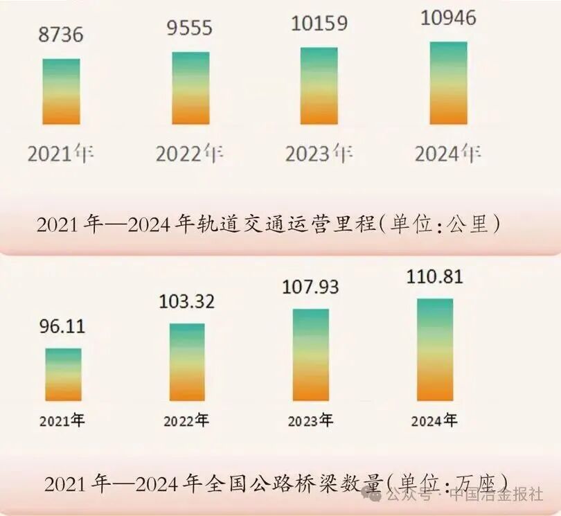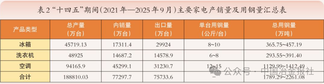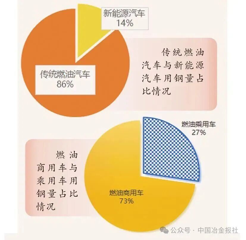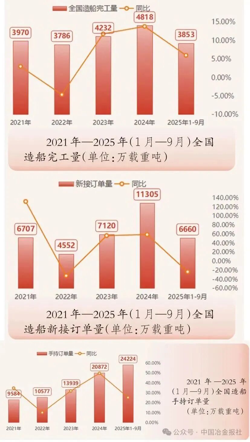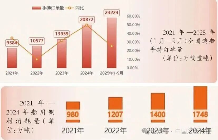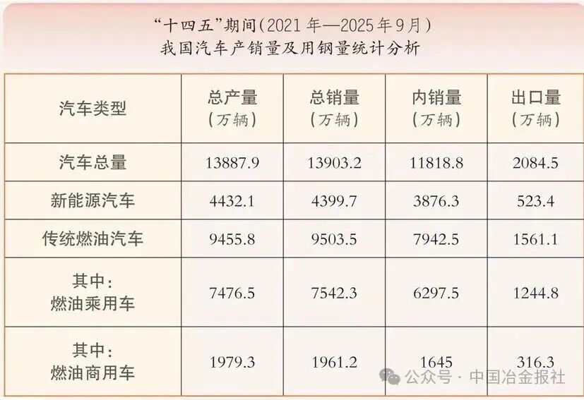 基础设施建设用钢 发展现状 “十四五”期间,我国基础设施建设实现历史性跨越。根据“十四五”规划纲要,基建投资重点由大规模新建逐步转向“补短板、强网络、提质增效”,传统与新型基础设施协同推进。 具体而言,“十四五”期间我国综合立体交通网主骨架建成率超90%,铁路、公路、水运、民航等网络规模持续扩大,交通固定资产投资累计超15万亿元,高铁新增投运里程超过1万公里,高速公路新增里程超过3万公里,世界级港口群、机场群基本成型;能源网架全面升级,全国发电装机突破30亿千瓦;水利、市政、信息等基础设施协同推进,5G、充电桩、算力中心等新型设施加快布局。 用钢情况及趋势 传统基建用钢需求进入高位平台期,增长动能减弱,结构出现分化。交通设施仍为用钢主力,重心从普速路网转向城际铁路、特大桥梁、港口枢纽等领域。截至2024年底,全国铁路营业里程达16.2万公里,高铁4.8万公里,“八纵八横”主干网基本建成,对钢轨、桥梁钢结构、线材螺纹钢仍有需求,但新开工高峰已过。公路、轨道交通、机场、港口持续完善,推动高强度钢轨、高性能桥梁钢板需求增长。城市更新与民生工程稳步推进,支撑建筑钢材需求,特别是装配式建筑发展为钢结构用材带来新增长点。 新型基础建设的用钢密度和总量低于传统基建,但对“质”的要求提升。截至2025年6月,我国累计建成5G基站455万个;截至2025年9月底,我国电动汽车充电基础设施(枪)总数达到1806.3万个,同比增长54.5%……这些新型基础建设将对高牌号电工钢、角钢、槽钢等特种钢材形成稳定需求。 据测算,2025年基建用钢量约为1.69亿吨,同比微降1%。“十四五”期间,基建用钢总量保持高位稳定,但结构深刻调整:传统螺纹钢、线材需求见顶回落,高强度、耐候、耐火钢及钢结构用材占比不断提升。 汽车行业用钢 发展现状 “十四五”期间,我国汽车产业实现高质量发展,传统汽车与新能源汽车协同发展格局稳固。截至2025年9月份,汽车累计产销量均突破13887万辆,其中新能源汽车产销占比显著提升。 国内市场方面,国家将新能源汽车确立为战略性新兴产业,通过顶层规划、技术标准与专项资金构建了全方位支持体系。政策驱动从“普惠性补贴”转向“精准化引导”,不仅促进了汽车产业的技术升级,还保证了内需市场持续稳固。 国际市场方面,我国跃居全球第一大汽车出口国。凭借完整的产业链、高性价比及在新能源领域的先发优势,汽车产品在“一带一路”市场表现突出,尤其是新能源汽车,出口覆盖180多个国家和地区,成为拉动整体出口的关键力量。 用钢情况及趋势 “十四五”期间,传统燃油汽车与新能源汽车累计用钢量达27038万吨。其中,传统乘用车用钢量约23270.7万吨,新能源汽车用钢量约3767.3万吨。传统燃油汽车的车身框架、底盘等部件采用高强度钢、热成型钢;新能源汽车对用钢更为严苛,关键部件大量使用超高强度钢与先进高强钢。未来,随着智能网联、绿色低碳技术的深度融合,汽车高端化、专用化用钢需求有望进一步增长,为制造业协同发展注入持久动力。 造船业用钢 发展现状 “十四五”期间,全球造船市场迎来新一轮景气周期,海运贸易总量每年基本按3%的复合增速扩张。中国造船业随之迈入繁荣周期,2024年我国在船舶市场份额居全球第一,造船完工量、新接订单量和手持订单量以载重吨计分别占全球总量的55.7%、74.1%和63.1%,以修正总吨计分别占50.3%、68.2%和55.4%。 用钢情况及趋势 随着造船业向大型化、高端化发展,造船用钢实现“量价齐升”。据估算,造船业年用钢量从早期约1000万吨攀升至“十四五”中后期的1500万吨左右。根据克拉克森航运经纪(上海)有限公司中长期预测,到2030年,年均造船完工量增长6.3%,按用钢量年均保持6%增长测算,预计2025年—2030年,中国造船用钢消耗总量将超过9000万吨。 在船用钢材的性能上,高强度和轻量化成为核心诉求。船用钢材需要能够承受巨大的压力和荷载,AH32、AH36、EH40等高强度船板屈服强度更高,逐步取代普通A/B级板,成为大型集装箱船、散货船和油船的主流选择。此外,LNG(液化天然气)船用殷瓦钢实现国产化突破,氢能、氨能等零碳燃料船舶用低温韧性钢、抗氢脆钢的研发也加快推进,标志着中国造船用钢正迈向更高端、更绿色的新阶段。 房地产用钢 发展现状 “十四五”期间,我国房地产行业经历了从高速增长向高质量发展的深刻转变。全国商品房销售面积在2021年达到17.94亿平方米的历史峰值后进入调整期,2025年1月—10月,房地产开发企业房屋施工面积652939万平方米,同比下降9.4%。但“十四五”累计销售规模依然可观,保障性住房建设与城镇老旧小区改造扎实推进,建筑业总产值达32.7万亿元。作为钢材消费的最大下游,房地产市场的调整直接影响了钢材供需格局。 用钢情况及趋势 用钢总量从峰值回落。受市场调整影响,房地产年均用钢量降至约2.7亿吨,较“十三五”下降约13%,呈现深度调整特征。 消费占比显著下降。房地产用钢占钢材总消费量的比重快速下滑,从2021年的约32%降至2024年的约28%,预计2025年将进一步降至23%左右。值得注意的是,2023年,基建领域在建筑钢材需求中的占比(54.13%)首次超过房地产(40.57%),结构发生历史性变化。 高强度钢筋快速普及。全国新建商品住宅平均用钢强度已从2015年的55千克/平方米提升至2023年的
