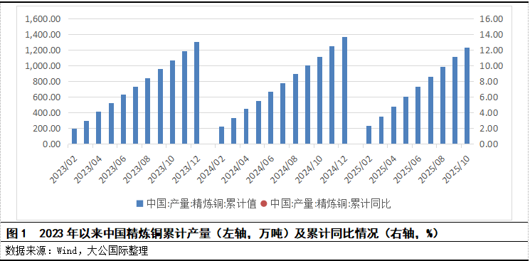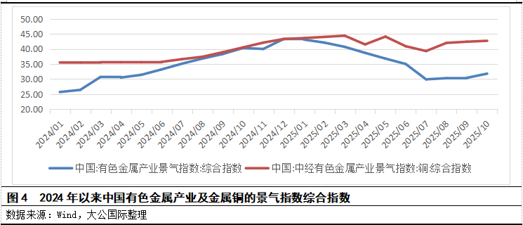 PART 01 政策环境 稳增长仍是行业发展基调,2025~2026年,有色金属行业增加值年均增长目标值较前两年略有下调。 2025年8月,多部门联合印发《有色金属行业稳增长工作方案(2025~2026年)》(以下简称“《稳增长方案》”),是继2023年稳增长方案的延续。《稳增长方案》提炼指出了目前对整个行业发展质量和效益提升的主要矛盾,并提出2025~2026 年行业增加值年均增长目标为5%左右,这一目标较2023~2024年有色金属工业增加值增速约5.5%的增幅指标略有下调;其中,对原生及再生金属产量都提出了增资发展目标。 加强矿产资源勘查,提升铜资源保供能力;进一步提升冶炼利用率。 从产业链环节来看,《稳增长方案》指出在资源端需进一步提升保障能力,重点提及铜资源的勘查并要形成国内找矿成果;国外方面,则支持与境外矿企合作,加大初级产品进口。在生产端需进一步提升采选冶技术水平,通过技术装备的升级,加大对不同品位矿产品的冶炼效率,同时加大对废铜、废旧电池等固废资源的回收利用,提升综合利用水平。2025年《铜产业高质量发展实施方案(2025~2027年)》(以下简称“《产业发展方案》”)提到“到2027年,产业链供应链韧性和安全水平明显提升”。在目前矿产资源偏紧的背景下,政策对于金属企业在生产过程中“吃干榨净”的能力提出了更高的要求。 完善行业标准化建设,提升标准供给能力。 2024年12月的《标准提升引领原材料工业优化升级行动方案(2025~2027年)》聚焦于行业标准管理,重点关注数字化转型、新材料及绿色低碳三方面,致力于2027年完成有色金属等行业的标准评估、优化,并提升标准供给能力。有色金属行业作为制造业重点行业之一,涉及智能采选、生产工艺优化、智能装备等多方面的关键技术标准。 持续推进产品创新、绿色化升级、数字化转型等,促进行业持续向好发展。 《稳增长方案》明确指出,要聚焦新能源汽车等战略性新兴产业的供应链需求,针对铜相关材料实施专项技术攻关,以实现产品综合性能的全面提升。以能效标杆及环保绩效A级标准为引领,深化铜冶炼等领域的节能减排与降碳技术改造,重点加速绿色节能装备的更新换代进程,例如铜锍连续吹炼设备等,并实施分阶段淘汰低效落后工艺技术。 支持区域化产业集群建设,推动铜产业高质量发展。 2024年底,江西省出台《关于支持打造国家级铜基新材料集群促进铜产业高质量发展的若干措施》,从当地铜产业基础出发,通过强化要素支持、支持创新升级等共十条措施,加快建设国家级铜基新材料集群。此外,《产业发展方案》在优化产业布局方面也提到我国铜产品集群建设重点方向,并直接点名提及了7个省的产业聚集区,除了江西鹰潭铜基新材料以外,其余6个重点产业集群分布在安徽省、福建省、甘肃省、湖北省、浙江省、山东省。 PART 02 主要行业指标 2024年全球铜矿产量和铜精矿产量均保持同比增长态势,但增幅均有所收窄,预计2025-2026年仍将保持小幅增长;2024年至今,铜价整体保持增长态势,且2025年铜景气度指数整体有所提升;2025年以来,采矿端和冶炼端的固定资产投资表现出现明显分化,有色金属冶炼及压延加工业的固定资产投资增速持续下降并转为负增长。 铜矿供应方面,智利、秘鲁、刚果金仍是铜矿的主产区,根据美国统计数据显示,2022~2024年全球铜矿开采量分别为2,190万吨、2,260万吨和2,300万吨,呈逐年小幅增长态势,2024年同比增速为1.77%,增速有所下降。根据国际铜研究小组(ICSG)披露数据,2025年1~7月,全球铜矿产量1,347.7万吨,同比小幅增长,产能利用率在80%;预计2025-2026年全年的全球铜矿产量同比增幅分别为1.4%和2.3%。 精炼铜方面,根据ICSG数据,2022~2024年全球精炼铜产量(包含原生和再生产量)分别为2,527.1万吨、2,650.1万吨和2,734.4万吨,保持逐年增长态势,但2024年增速有所下降。2025年1~7月该产量为1,656.5万吨,较上年同期的1,594.5万吨增长3.89%。根据国家统计局数据,2024年国内的精炼铜年产量为1,364.40万吨,同比增长5.05%,但增幅同比大幅度下降9.4个百分点;同年销量为1,700.45万吨,同比小幅增长。2025年1~10月产量为1,229.50万吨,同比增长10.08%(增幅较2024年同期同比提升,但仍低于2023年同期水平)。进口方面,2024年我国铜矿砂及其精矿进口量为2,811.00万吨,同比增长2.10%;2025年前十一个月为2,761.40万吨,同比增长8.00%。 价格方面,受贸易战等外部环境、宏观因素、供求关系、及资金流向等多方面因素影响,铜价整体呈增长态势。阴极铜期货结算价(以下简称为“铜价”)的2024年平均价格同比增长10.31%,2025年1~11月的平均价格同比小幅增长5.99%,2025年以来,全年铜价处于震荡走势,振幅较缓。其中2025年前3个月震荡增长,2025年3月26日价格上涨至82,410元/吨;4月初价格有所下降,最低点降至4月9日的72,500元/吨,这也是2025年以来的价格最低点,主要受到美国对等关税政策及贸易战的负面影响,作为大宗商品贸易及主要工业原料,预期需求的下降仍对铜价形成一定影响;之后铜价处于震荡上涨态势,10月份价格涨幅较大。 固定资产投资方面,2024年至今,矿采选业的固定资产投资增速整体呈“宽V”字型趋势表现,2024年8月增速仅为19.00%,较上月增速大幅下降20.90个百分点;随后呈继续温和上涨趋势,2025年9月上涨至49.30%。冶炼及压延加工业的固定资产投资增速整体呈“先平后降”趋势,2025年2月增速为16.10%,较上月大幅下降8.1
