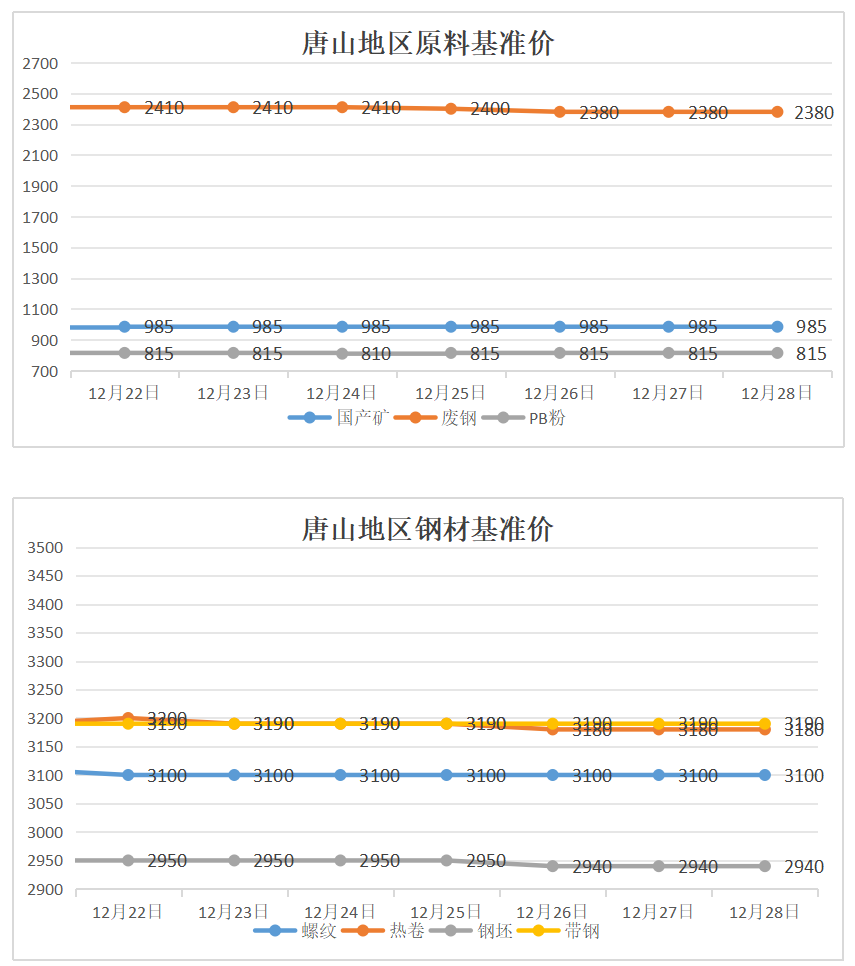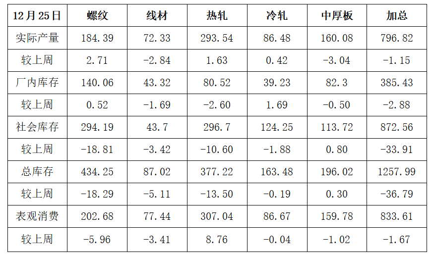 1 ● 国际资讯 ▲ 美国劳工部官网显示,截至12月20日当周初请失业金人数经季调后减少1万人,至21.4万人。连续两周下降且显著低于市场预期的22.4万人,显示短期新裁员压力有所缓解。 ▲ 美国政府23日宣布,将在2027年对中国芯片加征关税,结束了上届拜登政府发起的针对中国芯片的贸易调查。 美媒分析称,尽管美国政府称中国在芯片产业中的做法“损害美国利益”,但最终决定至少在18个月内不对中国芯片加征额外关税。 ▲ 美国第三季度实际GDP初值年化季环比大幅增长4.3%,远超市场预期的增长3.3%,增速创两年来最快。消费支出强劲成为增长的最大推手,当季增速大幅加快至3.5%。 ▲ 德国央行在预测报告中称,在经历多年经济低迷后,德国经济将于2026年逐步复苏,国内生产总值将增长0.6%。 ▲ 日本央行一致同意加息25个基点至0.75%,以抑制物价持续高涨的风险,利率水平达到30年高位。日本央行行长植田和男表示,正稳步接近实现2%通胀目标。日本目前的实际利率处于非常低的水平,如果经济前景符合预期,就将继续提高利率。 ▲ 韩国央行发布2026年货币政策声明,将对明年进一步降息保持开放态度,同时针对韩元走弱和房价上涨带来的金融稳定风险提高警惕。 2 ● 国内资讯 ▲ 2026年全国两会的具体召开时间已确定:十四届全国人大四次会议定于2026年3月5日在北京召开,建议全国政协十四届四次会议于2026年3月4日在北京召开。 ▲ 12月25日至26日,全国工业和信息化工作会议在京召开。会议指出,2026年要深入整治“内卷式”竞争,坚决遏制低价低质量竞争。 ▲ 国有资产法草案12月22日提请十四届全国人大常委会第十九次会议首次审议。制定基础性、综合性的国有资产法,完善国有资产法律制度体系,对于在法治轨道上提升国有资产治理效能意义重大。 ▲ 国家发展改革委产业发展司发布文章《大力推动传统产业优化提升》。文章指出,对新能源汽车、锂电池、光伏等“新三样”产业,关键在于规范秩序、创新引领。对钢铁、石化等原材料产业,关键在于平衡供需、优化结构。持续实施粗钢产量调控,严禁违规新增产能,促进优胜劣汰。 ▲ 十四届全国人大常委会第十九次会议12月27日表决通过相关议案,决定将生态环境法典草案、民族团结进步促进法草案、国家发展规划法草案提请明年召开的十四届全国人大四次会议审议。 ▲ 中央企业负责人会议12月22日至23日在北京召开。国家主席习近平近日对中央企业工作作出重要指示强调,中央企业要聚焦主责主业,持续优化国有经济布局,切实增强核心功能、提升核心竞争力。要立足实体经济,强化关键核心技术攻关,推动科技创新和产业创新深度融合。国务院总理李强出席会议并讲话。李强指出,要在推进重大基础设施建设中提供强力保障,加快传统基础设施更新和数智化改造,适度超前开展新型基础设施建设。 ▲ 国务院总理李强主持召开国务院“十五五”规划《纲要草案》编制工作领导小组会议,深入研究《纲要草案》编制工作。李强指出,要谋划一批能够带动全局的重大工程、重大项目、重大载体,既为未来发展积聚新动能、培育竞争力,又为当前扩大内需、稳定经济运行提供支撑。 ▲ 1—11月份,全国规模以上工业企业实现利润总额66268.6亿元,同比增长0.1%。1—11月份,黑色金属冶炼和压延加工业实现利润总额1115亿元,同比增长1752.2%。 ▲ 中国12月LPR出炉,1年期为3.0%,5年期以上LPR为3.5%,均连续7个月保持不变。 ▲ 财政部等9部门制定印发企业气候信息披露准则,现阶段将由企业自愿实施,后续将向强制披露扩展,从上市公司向非上市公司扩展。电力、钢铁、煤炭、石油、化肥、铝、氢、水泥、汽车等行业应用指南将在后续适时发布。 ▲ 全国住房城乡建设工作会议12月22日至23日在北京召开。会议指出,2026年要着力稳定房地产市场,因城施策控增量、去库存、优供给。在商品房销售上,推进现房销售制,实现“所见即所得”,从根本上防范交付风险。 ▲ 日前,国务院安委会印发通知,部署各地区、各有关部门和中央企业深入贯彻落实党的二十届四中全会精神和习近平总书记关于安全生产的重要指示批示精神,进一步压紧压实安全生产责任,落实落细各项安全监管制度和重点任务举措,切实做好岁末年初安全生产工作,坚决防范遏制重特大事故发生。 3 ● 钢市动态 钢企生产情况 ▲ 高炉开工率:78.32%,环比上周减少0.15%,同比去年减少0.39%,再创新低。 ▲ 独立电弧炉钢厂开工率:67.63%,环比下降1.6%,同比下降1.25%。 ▲ 日均铁水产量:226.58万吨,环比上周增加0.03万吨,同比去年减少1.29万吨。日均铁水产量连续10周在240万吨以下,处于相对低位。 ▲ 高炉炼铁产能利用率:84.94%,环比上周增加0.01% ,同比去年减少0.61%。 钢企盈利情况 ▲ 钢企成本情况:上周,本周唐山主流样本钢厂平均铁水不含税成本为2280元/吨,平均钢坯含税成本3041元/吨,周环比下调14元/吨。 ▲ 钢企盈利情况:与12月28日当前普方坯出厂价格2940元/吨相比,钢厂平均亏损101元/吨。 ▲ 钢企盈利率:37.23%,环比上周增加1.30%,同比去年减少12.55%。 ▲ 独立电弧炉盈利情况:全国90家独立电弧炉钢厂产品盈利情况,38.84%的钢厂微利,47.93%的钢厂持平(这其中部分因停产导致产品盈利情况持平),13.22%的钢厂亏损。 钢材市场供需 ▲ 供应量:五大钢材供应 796.82万吨,周环比降1.15万吨,降幅为0.1
