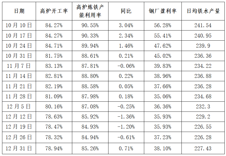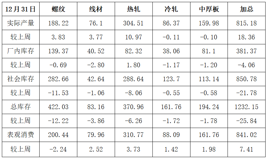 1 ● 国际资讯 ▲ 美国劳工部公布的数据显示,美国12月27日当周首次申请失业救济人数减少1.6万人,降至19.9万人,低于预期值21.8万人。 ▲ 2026年1月1日起,欧盟碳边境调节机制(CBAM)正式进入收费期,先纳入钢铁、水泥、铝、化肥、电力和氢6类产品,计划到2028年扩展至约180种钢铁和铝密集型下游产品,包括洗衣机、汽车零部件、机械设备等在内。 ▲ 美国总统特朗普预计将于1月宣布下一任美联储主席人选。目前来看,最终人选会在以下三人中选出,即白宫国家经济委员会主任凯文·哈西特、美联储前理事凯文·沃什、美联储理事克里斯托弗·沃勒。 ▲ 土耳其宣布自2026年1月2日起,对持中国普通护照的公民实行免签入境政策。根据规定,在每180天内,免签停留时间累计不超过90天,适用于旅游和过境目的。 ▲ 美国总统特朗普称,美方已成功对委内瑞拉实施打击,抓获委内瑞拉总统马杜罗及其夫人,并带离委内瑞拉。联合国秘书长古特雷斯对委内瑞拉近期局势升级深感震惊。联合国安理会将于当地时间1月5日10时就美国对委内瑞拉军事行动举行紧急会议。 ▲ 韩国总统李在明将于1月4日至7日对中国进行国事访问。此访的目的是最大限度地减少或消除以往存在的矛盾或误解,推动韩中关系跃升并发展到新阶段,使两国牢固确立为相互助力彼此发展的关系。 2 ● 国内资讯 ▲ 国家主席发表二〇二六年新年贺词称,我国经济总量连续跨越新关口,2025年预计达到140万亿元。2026年是“十五五”开局之年,要锚定目标任务,坚定信心、乘势而上,扎实推动高质量发展,进一步全面深化改革开放,推进全体人民共同富裕,续写中国奇迹新篇章。 ▲ 国务院关税税则委员会关于发布《中华人民共和国进出口税则(2026)》,自2026年1月1日起实施。 ▲ 商务部新闻发言人就欧盟碳边境调节机制有关问题答记者问指出,坚决采取一切必要措施回应任何不公平贸易限制。 ▲ 国家发改委组织下达2026年提前批“两重”建设项目清单和中央预算内投资计划,共计约2950亿元,加快各类资金拨付和使用节奏。 ▲ 商务部:2025年,以旧换新相关商品销售额超2.6万亿元,惠及超3.6亿人次。其中,汽车以旧换新超1150万辆,家电以旧换新超1.29亿件,家装厨卫“焕新”超1.2亿件。 ▲ 2026年一季度水泥企业错峰生产区域差异显著。河北、山东、山西、陕西、内蒙古、新疆、辽宁、黑龙江、吉林一季度全停,错峰90天。湖南错峰不少于70天,贵州不少于65天,陕西停69天,河南60天。 ▲ 2025年12月份河北省钢铁行业PMI为46.0%,环比下降3.1个百分点,连续四个月处于荣枯线以下。 3 ● 钢市动态 钢企生产情况 ▲ 高炉开工率:78.94%,环比上周增加0.62%,同比去年增加0.84%。 ▲ 独立电弧炉钢厂开工率:68.63%,环比上升1个百分点,同比上升0.77%。 ▲ 日均铁水产量:227.43万吨,环比上周增加0.85万吨,同比去年增加2.23万吨。 ▲ 高炉炼铁产能利用率:85.26%,环比上周增加0.32% ,同比去年增加0.71%。 钢企盈利情况 ▲ 钢企成本情况:上周,唐山主流样本钢厂平均铁水不含税成本为2269元/吨,平均钢坯含税成本3029元/吨,周环比下调12元/吨。 ▲ 钢企盈利情况:与1月4日普方坯出厂价格2930元/吨相比,钢厂平均亏损99元/吨。 ▲ 钢企盈利率:38.1%,环比上周增加0.87%,同比去年减少9.95%。 ▲ 独立电弧炉盈利情况:全国90家独立电弧炉钢厂产品盈利情况,39.67%的钢厂微利,47.11%的钢厂持平(这其中部分因停产导致产品盈利情况持平),13.22%的钢厂亏损。 钢材市场供需 ▲ 供应量:五大钢材供应815.18万吨,周环比增18.36万吨,增幅为2.3%。 ▲ 库存量:五大钢材总库存1232.15万吨,周环比降25.84万吨,降幅为2.1%。 ▲ 消费量:五大品种周消费量841.02万吨,环比增0.9%:其中建材消费增0.1%,板材消费增1.3%。 停复产及生产调整 ▲ 邯郸、衡水、邢台、沧州、保定5市发布重污染天气橙色预警,定于2026年1月2日12时启动Ⅱ级应急响应,解除时间另行通知。 ▲ 据不完全统计,2025年12月以来国内22家钢厂发布检修信息,供应端有所收紧。进入12月下旬以来,随着建筑钢材钢厂利润改善,部分钢铁生产企业进一步减产的动力减弱,部分区域有复产的情形,1月份产量或将维持在180-200万吨/周水平。考虑到1月份农历新年即将到来,需求将走弱,因此供需压力将会有所增大。 ▲ 山西建龙850mm带钢轧线已于12月29日开始停产检修,计划检修时间36天,预计影响热轧带钢日产量0.5万吨。 ▲ 龙腾特钢计划于1月19日起对2座高炉轮流检修,为期11天,预期影响铁水产量5000吨/日;另1月9日到2月15日对一条小棒线进行检修,预计影响小棒产量2500吨/日,1月19日-2月2号对中棒线进行检修,预计影响中棒产量3000吨/日。 ▲ 12月29日,天钢公司设备大修正式拉开帷幕。此次大修以3#转炉炉役、2#转炉炉壳更换为主线,共计2470个项目,计划检修39天。 ▲ 独立电弧炉钢厂停复产情况: 西南重庆区域一钢厂因环保检查,两座70T电弧炉从12月27日至12月29日开始停产,影响日产约0.23万吨; 华中湖北区域一钢厂一座100T电弧炉从12月25日开始复产,影响日产约0.51万吨。 焦企盈利情况 ▲ 全国平均吨焦盈利-14元/吨;山西准一级焦平均盈利1元/吨,山东准一级焦平均盈利34元/吨,内蒙二级焦平均盈利-67元/吨,河北准一级焦平均盈利43元/吨。 铁矿石最新数据 ▲ 到港总量:12月22日-12月28日中国47港到港总量2727.8万吨,环比减少62.4万吨;中国45港到港总量2601.4万吨,环比减少45.3