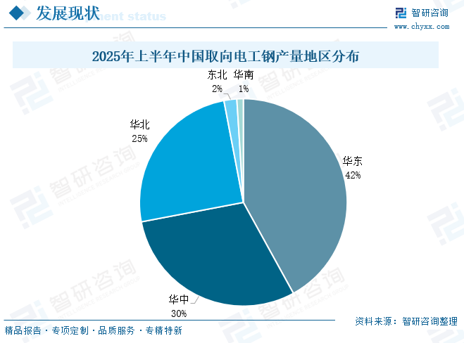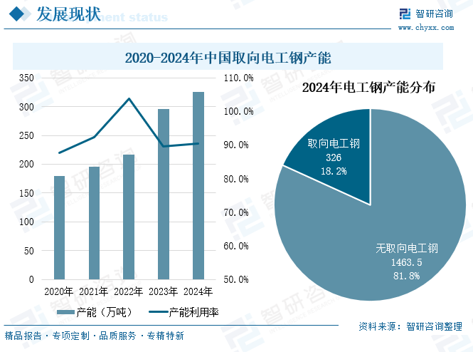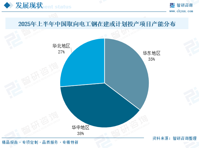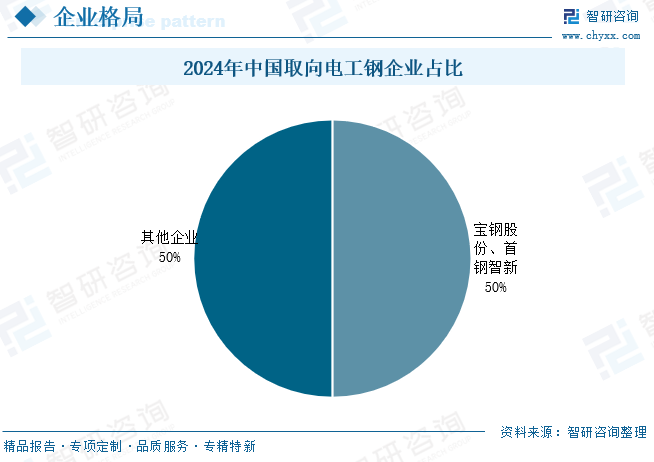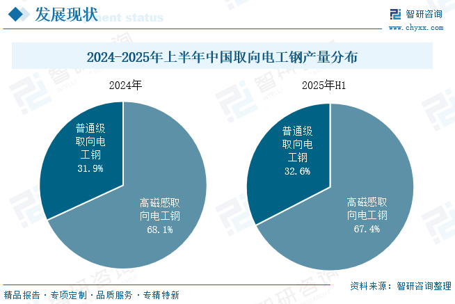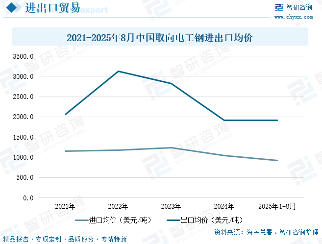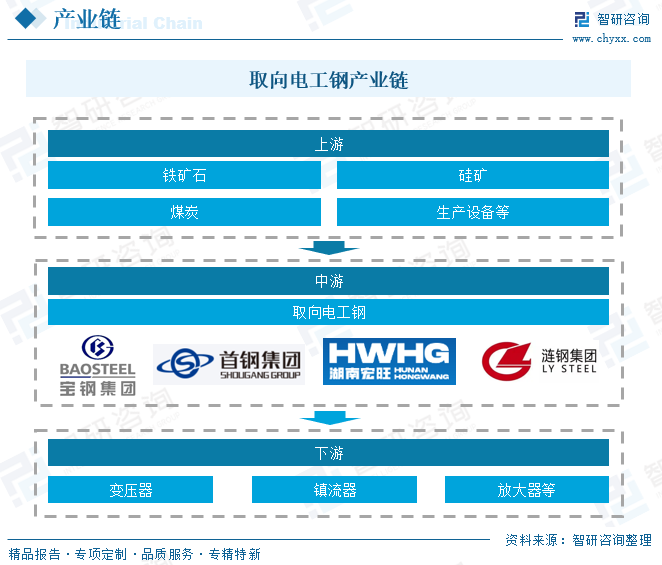 电工钢通常是指冷轧电工钢,分晶粒取向电工钢和晶粒无取向电工钢两大类。取向电工钢易磁化晶粒方向沿轧制方向分布,轧制方向具有高磁感、低铁损及低的磁致伸缩等优良特性,同时还可通过细化磁畴的技术处理,获得更低的铁损,广泛应用于变压器行业;无取向电工钢晶粒方向随机分布,电磁性能各向均匀,广泛应用于电机行业。 自钢铁作为磁性能功能材料以来,取向电工钢的研究和生产经历了几十年的发展,从冶炼、连铸到轧制等全工艺流程,经历了不断迭代的技术革新和装备发展,当今世界上主要取向硅钢企业已经实现了成分控制、晶粒组织控制和板型平整度的各环节精确控制,生产能力和产量都得到了大幅增长。2019年,宝钢成功开发了顶级取向电工钢B18R055和B20R060,这类产品不仅在性能上取到了新的历史性突破,在新产品的全流程开发中也体现了中国钢铁企业顺应全球绿色发展、节能减排的发展趋势,标志着中国在取向电工钢自主创新能力上的综合实力达到新的高度。 相关报告:智研咨询发布的《中国取向电工钢行业市场全景评估及投资潜力研判报告》 取向电工钢行业产业链 取向电工钢作为工业生产的重要原材料,产业链相对简单,上游是铁矿石、硅矿、煤炭等原材料;中游为取向电工钢加工制造;下游为应用领域,取向电工钢是各类变压器、镇流器、放大器、稳压器、继电器、整流器、电磁开关等定向磁场电器产品制作铁芯的核心材料。 变压器为取向电工钢最大应用领域。变压器是利用电磁感应的原理来改变交流电压和电流的装置,主要构件是初级线圈、次级线圈和铁芯。取向电工钢是制造变压器铁芯的关键材料,其性能直接决定变压器的能效和可靠性。根据中国电器工业协会变压器分会数据,2024年全国变压器行业总产量约为19.5亿kVA,较2023年增加11%。其中,高压变压器(66kV及以上)产量12.83亿kVA,配电变压器(35kV及以下)产量6.45亿kVA。随着全球经济继续电气化,预计变压器需求将持续增长,对取向电工钢需求将会增加。 取向电工钢行业市场现状 1、产能 随着新项目投产,近几年我国取向电工钢产能稳步扩大,2024年,我国电工钢动态产能达到1789.5万吨。其中,取向电工钢产能为326万吨(不含停产产能约7万吨),占电工钢总产能的18.2%,产能利用率处于高位,2022年产能利用率超100%,2024年产能利用率为90.5%。 据统计,2025年上半年,全国取向电工钢在建及计划项目共15项,年产能167万吨。新增产能地域化特征非常明显,作为需求最大的经济区域,华东地区新上取向电工钢项目5家,涉及产能59万吨,占全国总产能的35%;华中地区新上取向电工钢项目6家,计划新增产能64万吨。华北地区新上取向电工钢项目4家,计划新增产能44万吨。 2、供需现状 取向电工钢凭借其出色的磁导率和高电阻率,已成为生产高能效变压器和高性能发电机的重要材料之一。我国取向电工钢供需端整体呈现良好发展态势,2024年我国取向电工钢产量为295万吨,同比增长超11%,表观需求量为238.1万吨。2025年上半年,取向电工钢产量158.11万吨,同比增长17.30%;表观需求量为123.50万吨。 取向电工钢供给十分集中,华东、华中、华北为取向电工钢主要生产基地,三大区域占据了全国97%的产量。其中华东地区2025年上半年取向电工钢产量为67.17万吨,占比42%;华中产量为46.89万吨,占比30%;华北地区产量为39.29万吨,占比25%。主要原因为这三大区域经济较发达,变压器产品厂家资源较丰富,产销已形成区域性消化模式。 取向硅钢一般按照磁性能分为高磁感取向硅钢(Hi-B)和普通取向硅钢(CGO)两类。1934年GossNP发明普通取向硅钢(CGO)产品,1968年新日铁开发出性能优异的Hi-B钢,1996年中国开始生产Hi-B钢,至今经过数十年的发展,取向硅钢产品性能得到了巨大的提升。由于下游用户产品能效升级,市场对CGO钢的需求不断萎缩,倒逼生产企业产品结构升级,CGO钢产量逐渐下降,Hi-B钢占比越来越大,已成为市场主流产品类型。2025年上半年我国高磁感取向电工钢产量约为106.61万吨,占比67.4%,同比增长15.9%;普通取向电工钢产量约为51.50万吨,占比32.6%,同比增长20.3%。 3、进出口贸易 2015年我国取向电工钢从“净进口”演变为“净出口”格局,随后取向电工钢出口规模不断扩大,2024年出口量达64.2万吨,出口金额为12.26亿美元;进口量仅为7.28万吨,进口金额为0.75亿美元。2025年1-8月出口量为51.04万吨,进口量为6.44万吨。 从进出口均价来看,我国取向电工钢出口均价高于进口均价,同时进口均价较为平稳,2021-2024年期间进口均价在1000-1250美元/吨之间小幅波动;而出口均价震动幅度较大,2022年达3126.8美元/吨。2025年1-8月进出口均价分别为918.2美元/吨、1918.4美元/吨。 4、企业格局 2024年,我国取向电工钢生产企业25家,产量排名前5位的企业分别是宝钢股份(宝山基地、青山基地)、首钢智新、宏旺集团(湖南宏旺)、重庆望变和包头威丰。2024年我国取向电工钢企业在技术研发上持续投入,生产工艺、产品性能等方面取得显著突破。其中,宝钢股份、首钢智新凭借深厚技术沉淀与高强度研发投入,共占50%市场份额,处于行业领先;湖南宏旺、重庆望变、包头威丰等企业凭借对技术研发的高度重视与不断突破,在HiB 生产方面取得了快速且显著的提升;涟钢电磁、赤峰远联等企业则深挖周边产业链的协同效应与绿电供应优势,构建起差异化竞争优势;无锡普天(新普电气)“借