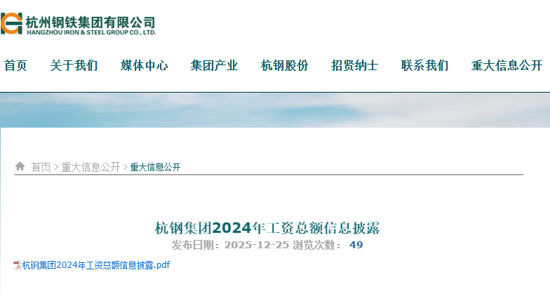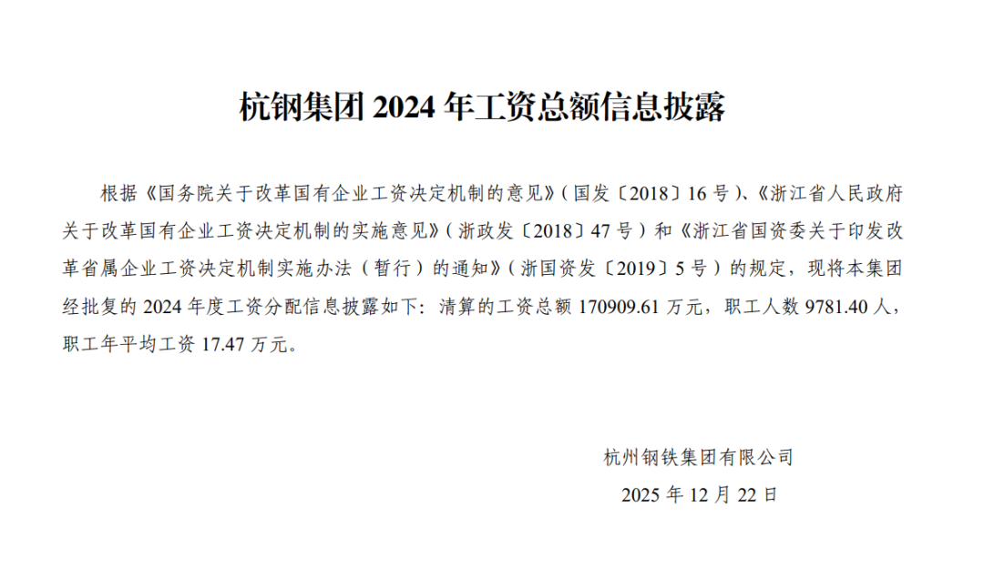 2025年12月25日,杭钢集团2024年工资总额信息披露:清算的工资总额170909.61万元,职工人数9781.40人,职工年平均工资17.47万元。
