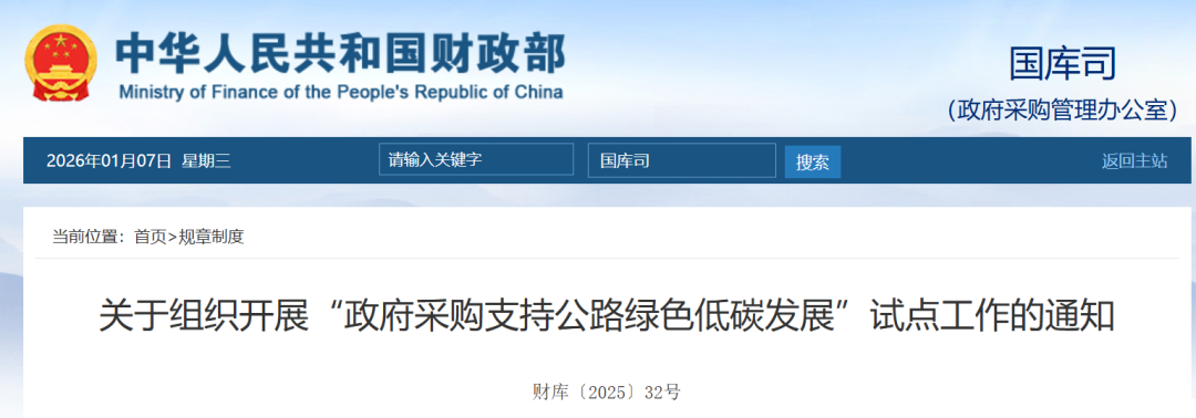 各省、自治区、直辖市、计划单列市财政厅(局)、交通运输厅(局、委),新疆生产建设兵团财政局、交通运输局: 为发挥政府采购政策功能,推动公路绿色低碳发展,助力加快建设交通强国,按照《中共中央 国务院关于加快经济社会发展全面绿色转型的意见》和《国务院办公厅关于印发〈政府采购领域“整顿市场秩序、建设法规体系、促进产业发展”三年行动方案(2024—2026年)〉的通知》(国办发〔2024〕33号)相关工作部署,财政部、交通运输部决定开展“政府采购支持公路绿色低碳发展”试点工作。现将有关事项通知如下: 一、总体要求 以习近平新时代中国特色社会主义思想为指导,深入贯彻党的二十大和二十届历次全会精神,全面落实习近平生态文明思想,立足新发展阶段,完整准确全面贯彻新发展理念,构建新发展格局,推动高质量发展,发挥政府采购政策示范引领作用,进一步提升公路绿色低碳发展水平,为加快建设交通强国、积极稳妥推进碳达峰碳中和、全面推进美丽中国建设提供更好支撑。 试点任务为:选择一批绿色发展基础较好的公路项目,开展政府采购支持公路绿色低碳发展试点,积极推广应用“新材料、新技术、新工艺、新方法”(以下简称“四新”技术),探索应用绿色低碳技术、绿色材料(含设备,下同)的有效模式。试点目标为:到2028年,政府采购支持公路绿色低碳发展试点工作取得明显进展,在公路领域创新应用绿色低碳技术和绿色材料,基本形成支持公路绿色低碳发展的政府采购需求标准,政府采购支持公路绿色低碳发展的政策措施和工作机制更加完善,推动公路绿色低碳发展水平持续提升。 二、试点范围 (一)试点项目范围。试点项目涵盖各地区国道、省道、县道、乡道等各级公路,可以是处于规划、可行性研究、设计、招标(采购)、施工、运营、养护等阶段的公路项目,也可为跨上述多个阶段实施的公路项目。 (二)试点组织单位和实施单位。试点组织单位为省级财政部门、交通运输主管部门。试点实施单位原则上为设区的市级以上交通运输主管部门,由市级以下交通运输主管部门负责的符合试点要求的县道、乡道项目,应归集到市级交通运输主管部门进行申报和实施。 (三)试点期限。试点时间为3年。试点任务原则上应于2028年12月31日前申请验收,鼓励具备条件的试点任务提前申请验收。 (四)试点申报条件。鼓励各地区积极创造条件参与试点任务,申报试点需具备以下条件: 1.试点地区应当具备较好的绿色低碳技术应用基础,包括交通资源循环利用较好、政府绿色采购政策实施情况较好等; 2.试点实施单位应当具有较强试点意愿,具有一定的建设、组织、管理能力和技术力量等; 3.试点实施单位管辖范围内公路项目近3年未发生较大及以上等级生产安全事故; 4.试点项目应当具备应用“四新”技术的条件,通过先行先试能够在部分领域实现率先突破,形成良好示范效应。 (五)试点申报程序。 1.试点组织单位负责组织本地区试点任务的申报。试点组织单位组织试点实施单位结合本地区发展实际和优势特点,编制《政府采购支持公路绿色低碳发展试点任务申报表》(附件1),择优向财政部、交通运输部推荐。申报材料需纸质版4份(A4纸打印),并提供电子版(光盘),于2026年1月31日前报财政部国库司。 2.财政部国库司、交通运输部财务审计司、交通运输部公路局(以下统称试点指导单位)根据申报情况,共同研究确定试点任务,并于2026年3月6日前以厅函联合批复。 三、试点内容 (一)形成公路绿色低碳发展政府采购需求标准。财政部、交通运输部根据现代化综合交通体系发展方向,结合绿色发展相关技术要求、交通资源循环利用等现行国家标准和行业标准,总结实践经验,制定发布《政府采购支持公路绿色低碳发展基本要求(试行)》(以下简称《基本要求》,附件4),并根据试点推进情况适时进行动态调整。相关地区要在落实《基本要求》的过程中,探索政府采购支持公路绿色低碳发展模式,结合本地区实际,不断细化相关设计规范、施工规范、验收规范,以及绿色材料技术标准,研究提出完善《基本要求》的意见建议报财政部、交通运输部。财政部、交通运输部结合试点情况研究形成客观、量化、可验证、可推广的公路绿色低碳发展政府采购需求标准。 (二)加强试点任务全流程管理。 1.试点实施单位要严格执行《基本要求》,根据试点项目实施进展,在规划、可行性研究、设计、招标(采购)、施工、运营、养护、验收等工作过程中,落实政府采购支持公路绿色低碳发展政策。 2.试点实施单位可以根据当地实际情况,落实《基本要求》中的全部或者部分要求,对《基本要求》中的建设要求、产品要求、设备(系统)要求的具体指标进行微调,因地制宜应用绿色材料、工艺和技术。 3.试点实施单位应当要求相关咨询设计单位在编制项目建议书、可行性研究报告、设计文件时,将《基本要求》有关规定嵌入其中,并严格审查或者委托第三方机构审查可研、设计文件合理执行《基本要求》的情况。 4.试点实施单位应当将《基本要求》有关规定作为招标(采购)文件中的实质性要求或者设置为加分项,直接采购或者要求承包单位使用符合要求的绿色材料、工艺和技术,制定相应的履约验收标准和验收方案,并在合同中作出明确约定。 5.试点实施单位应当督促供应商