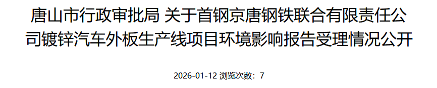 近日,首钢京唐钢铁联合有限责任公司(以下简称“首钢京唐”)新建镀锌汽车外板生产线项目正式进入审批推进关键阶段,项目相关环境影响报告已顺利通过唐山市行政审批局受理公示。这一举措不仅为企业自身转型升级加码,更将为河北钢铁产业对接新能源汽车产业链注入重要力量。
