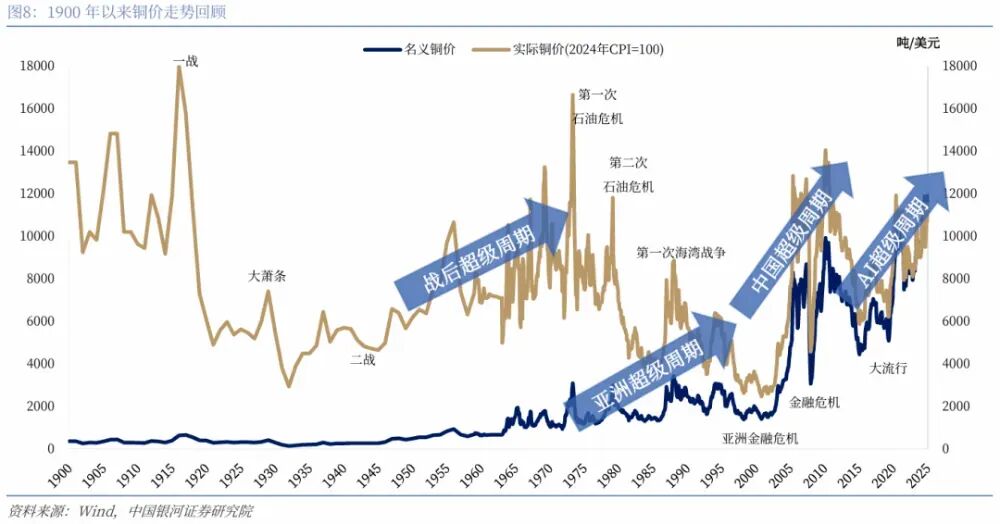 2025年开年不到9000美元每吨,到2026年1月14日突破13000美元每吨的整数关口,整体涨幅约46%。 这背后藏着AI的需求爆发、铜矿的供应短缺,及全球大国博弈等错综复杂的关系。此外,铜价上涨也正悄然影响着大家的消费预期,甚至有可能会慢慢推动全球经济的复苏。这是因为铜往往被视为经济复苏的先行指标之一。根据过往经验,每当全球经济从低谷往上爬坡时,铜价就往往先一步上行。比如,1949—1980年的战后超级周期,二战结束后,欧洲和日本大规模重建,城市化快速推进。与此同时,智利、赞比亚等产铜国推动铜矿国有化,供给不确定性增加。在需求复苏与供给约束的双重作用下,铜价经历了25年的震荡上行。比如,1985—1995年的亚洲超级周期,日本、韩国经济快速崛起,汽车、电子、机械产业蓬勃发展。东亚经济体通过出口导向实现高速增长,对铜的需求集中爆发。这一轮周期持续10年,铜价涨幅达120%。再比如,2003—2018年的中国超级周期,中国加入WTO后,基础设施建设、房地产开发和制造业扩张带动铜需求飙升。这是历史上最壮观的超级周期,铜价涨幅达280%,彻底重塑了全球矿业格局。当下,铜,正站在第四轮超级周期的起点上,AI超级周期。这一次,如果对比之前周期的涨幅,还有空间;但是,路径也会更加曲折。传统认知里,铜价是经济的“体温计”。经济好了,大家拼命地建房子、造车子、开工厂,用铜的地方就多,价格自然上涨。但这次,体温计显示“高烧”即铜价高位,经济的“体感”似乎没那么热。参考银河证券的研究,结论就是这次的铜价和全球制造业景气度,出现了显著背离。说明推动铜价的,不再是大家看得见的“买房买车”这些传统需求了,而是一股更深层、更结构性的力量。正是这股力量,开始让“铜博士”挣脱传统经济周期的束缚,迎来新的上涨周期。这背后的逻辑有两个,分别是AI带来的新需求,以及美元铜的战略储备带来的新需求。AI很强大,是因为算力很强大,而算力很强大就会极大地消耗电力。而电输送的过程中,每一步都离不开铜。大家每次与ChatGPT、Deepseek、豆包等对话时,背后都是一个个耗电量惊人的数据中心在支撑。这些“算力工厂”是真正的用电大户,也更是用铜大户,比如配电、散热、服务器等这些都离不开铜的支持。根据国际能源署(IEA)的数据,到2030年,全球数据中心的电力负荷可能会翻一番以上!据此测算,仅数据中心扩张,到2030年就会带来79万到170万吨的新增铜需求。这意味着,仅数据中心的扩张,平均每年就要多消耗一个中型铜矿的产量!而这只是冰山一角,因为新能源汽车、智能电网的升级也需要大量的铜。国际能源署(IEA)预计,到2030年,与新能源和电网相关的铜需求将增长41%。所以,这轮铜的需求增长,并不是取决于大家这个月多买了几台空调,多看了一会儿电视。而是取决于新的科技革命对铜资源需求的拉动程度。这是第一个逻辑。第二个逻辑则是,美国疯狂地囤铜,似乎要把铜和美元挂钩。这些年来,各国央行都在疯狂买黄金。为什么?本质就是对美元信心的动摇。那么,美国自己看不到吗?他们当然看得到,而且他们在急切地寻找“解药”。而这个“解药”之一,可能就是构建“铜美元”循环。大家想一下,如果全球大部分的可交割的铜都控制在美国手中,会发生什么?当全球都需要铜的时候,又会发生什么?铜的定价、交易将更深度绑定美元,就能为美元信用提供新的支撑。数据显示,美国实际消费的铜仅占全球6%—7%,但他们却疯狂囤铜。这就导致了,伦敦、上海交割库存都在下滑,而美国的库存过去两年却在一直增加,占比增至全球可交割铜的50%以上!美国这种“囤货”行为,早已超出应对短期关税的范畴,更像是一场国家级别的战略储备行为。“铜博士”这一轮周期除了上述的两个新兴逻辑之外,它原本自身的供需关系也面临着严峻的考验。铜矿从发现到投产,漫长而艰难,往往需要7—10年的时间。而过去铜价低迷,导致全球矿业公司前些年的资本投入严重不足。如今需求井喷,供给根本来不及反应。此外,全球主要产铜国如智利、秘鲁等,纷纷提高矿业税、要求利益分成,希望将更多资源留在本国,这直接拖慢了新矿开发的节奏。环保问题也日益严重,2023年底,全球最大铜矿之一巴拿马的Cobre Panama铜矿因环保争议被政府关闭,一夜之间全球损失了约1.5%的供应量。权威机构在一份报告中警告,全球铜的供应正在面临永久性的、结构性的短缺。到2050年,全球铜缺口可能达到惊人的1900万吨。铜价的高位运行可能不是短期现象,铜的新周期可能远远没有结束。这也包括老百姓的日常生活,而且会很直接!它和老百姓的生活,就像面粉和面包的关系,面粉贵了,面包也就距离涨价不远了。众所周知,新能源汽车的零部件、动力电池等是用铜大户,空调、冰箱的电机也是用铜大户。这些产品的成本正被铜价慢慢推高。就是说,大家将来买车、换家电,以及其它和铜有关的产品,可能都要多掏钱。这虽然增加了大家的支出。但是反过来看,这对于相关企业上下游利润的修复也许是好事。企业有了利润,才有动力给员工加薪,才有能力扩大再生产,经济才有可能进入良性的循环。当然,大家可以怀疑这是不是真正的经济复苏,但这并不妨碍有心的人去重视“铜博士”发出的积极信号。这轮铜的超级周期,可能不是简单的经济周期波动。而是,AI科技、铜美元信用两