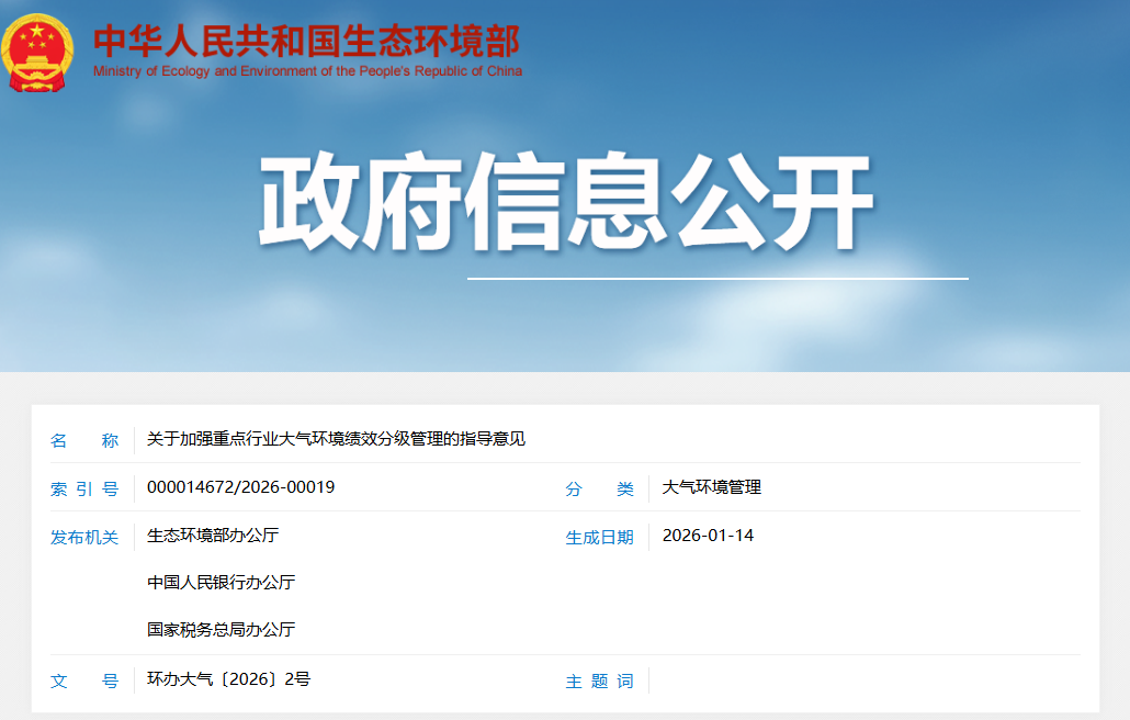 关于加强重点行业大气环境绩效分级管理的 指导意见 环办大气〔2026〕2号 各省、自治区、直辖市及新疆生产建设兵团生态环境厅(局),中国人民银行上海总部,各省、自治区、直辖市及计划单列市分行,国家税务总局各省、自治区、直辖市及计划单列市税务局: 为大力推进美丽蓝天建设,进一步加强和规范重点行业大气环境绩效分级(以下简称绩效分级)管理,制定本指导意见。 一、总体要求 以习近平生态文明思想为指导,深入贯彻党的二十大和二十届历次全会精神,完整准确全面贯彻新发展理念,落实全国生态环境保护大会部署要求,建立健全国家统筹、省级组织、市级实施的绩效分级管理机制,完善“1+1+1+N”绩效分级管理体系,即一个指导意见、一个管理平台、一个技术总则、N个重点行业技术指南,严格开展绩效分级,大力推进差异化管理,鼓励先进,鞭策后进,不断提升重点行业绩效等级,促进空气质量改善与行业高质量发展双赢。 工作中要做到:坚持自主自愿,企业结合实际情况,自主自愿申报绩效分级;坚持公正公开,绩效分级管理全流程公开,接受社会监督,鼓励行业协会和技术机构共同参与;坚持差异管理,实施基于绩效分级的差异化激励和监管政策,激发企业提升绩效水平的内在动力;坚持创新驱动,深度融合创新、绿色发展理念,将行业创新技术动态纳入绩效分级指标,引导企业技术革新,助力发展新质生产力。 二、完善技术和管理体系 (一)科学划分绩效等级 根据绩效指标水平先进程度,原则上将绩效分为“A/B/C/D级”,A级指所有指标均达到行业先进水平,B级指相关指标达到行业良好水平,C级指相关指标达到行业中等水平,D级指相关指标符合法律法规及相关标准的最基本要求。对一些装备、工艺、治理等较简单的行业,将绩效分为“A/B/C级”,C级指相关指标符合法律法规及相关标准的最基本要求。绩效等级评定按照“短板原则”,以各指标最低等级确定企业绩效等级;企业涉多个重点行业时,按行业分别评级,以所涉行业的最低等级作为企业总体绩效等级。 为鼓励企业不断创新,发挥引领作用,生态环境部面向A级企业遴选A+级企业。A+级企业指采用国际领先且能够连续稳定运行两年以上的创新性、突破性装备或技术,减污降碳效果显著,明显先进于同行业其他A级的企业。 (二)优化技术指标 按照源头、过程、末端管理全覆盖,促进企业绿色发展的原则合理设置绩效分级指标,主要包括装备水平、工艺水平、能源清洁水平、污染治理技术、大气污染物排放水平(排放限值)、无组织排放管控水平、监测监控水平、环境管理水平、运输方式、运输管理水平等。 (三)完善技术文件 生态环境部进一步制修订绩效分级技术文件,包括绩效分级技术总则、重点行业技术指南等。其中,技术总则主要明确绩效分级总体技术要求,重点行业技术指南规定各行业绩效分级指标及其核查方法。省级生态环境部门可根据本地工业污染特征、相关行业治理水平、管理能力等具体情况,对国家已制定绩效分级指标的行业,制定严于国家的地方绩效分级指标;对国家尚未制定绩效分级指标的行业,可制定地方绩效分级指标。省级生态环境部门制定的绩效分级指标技术文件报生态环境部备案。 (四)优化管理机制 生态环境部统筹指导全国绩效分级工作,不断完善管理和技术体系。省级生态环境部门负责组织开展本行政区域绩效分级,评定A、B级企业;可在协商一致的基础上,加强省级相关部门分工协作,共同推进绩效分级。设区的市级和省直管的市县级生态环境部门具体实施分级工作,组织本行政区域企业申报,对A、B级企业开展初审,评定C级及以下企业。实施绩效分级动态管理,企业可根据需要申报评定或申请变更绩效等级,相关部门根据评定结果及时更新企业绩效等级。 (五)建设统一工作平台 生态环境部建设全国统一的绩效分级工作平台(以下简称工作平台),集成企业申报、审核评定、评级降级结果公示公开、绩效等级查询等功能,面向企业、各级生态环境部门和社会公众开放,实现“一站式”管理服务。 三、强化跟踪监管 (六)建立健全定期评估复核机制 生态环境部开展绩效分级管理和技术体系定期评估,适时更新管理政策和技术文件。各级生态环境部门、行业协会在研究论证和试点基础上,可推荐创新性技术。经评估,对其中先进适用的技术,可按程序纳入绩效分级指标。省级生态环境部门对本行政区域A级企业开展定期复核,自评定之日起每满5年至少进行一次复核,并结合实际情况确定频次对B级及以下企业进行复核。复核内容包括绩效分级指标符合性及复核周期内的整体表现等。 (七)强化日常监管各级 生态环境部门应加强对已评级企业跟踪管理,建立健全绩效等级先进企业现场抽查机制。生态环境部重点针对A级及以上企业进行现场抽查,省、市两级生态环境部门重点对A、B级企业开展现场抽查,根据工作实际合理确定抽查比例和频次。 (八)加强社会监督 绩效分级工作应充分接受社会监督,任何单位、个人均可通过工作平台查询企业绩效等级信息。发现已评级企业存在实际情况不符合相应绩效分级指标要求的,可向相应绩效等级评定部门或其上级部门举报。各级生态环境部门应当及时核实举报信息,并严格保密。 (九)完善降级管理 对定期复核、日常监管、举报核实中发现企业