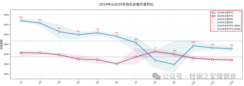 另外一个更为反常信息,2025年的热轧板卷全年均价3346元/吨,对比2024年全年均价3669元/吨下降了323元/吨,降幅8.8% ,市场价格一路下行,为什么利润却大幅上涨?