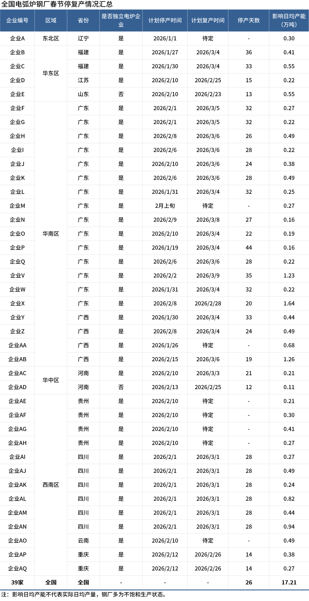 从停产方面来看,停产启动时间从1月1日延续至2月上旬,其中1月下旬至2月上旬为集中停产期,约70%的企业在此期间停炉,整体节奏较2025年推迟3-5天;从复产方面来看 ,复产节奏普遍更为谨慎,最早复产时间为2月23日,多数企业计划3月1日至3月6日(元宵节前后)复产,近半数企业复产时间仍待定,整体复产节奏较2025年有所延后。此外,样本企业平均停产天数约26天,最长达44天,最短仅12天,其中华南区、西南区企业停产周期普遍较长,多在28-44天,华中区、华东区部分企业则维持12-15天的短周期停产。在产量方面,样本企业总影响日均产能约17.21万吨,总日均产量约9.8-10.1万吨。