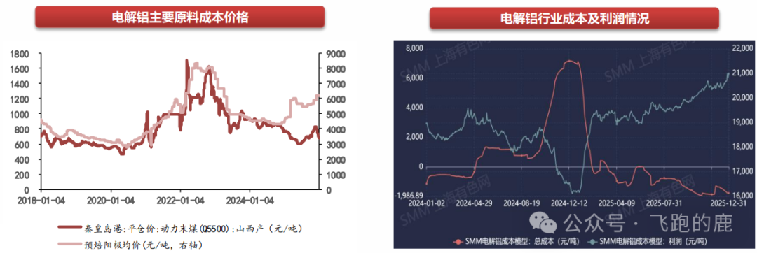 电解铝的核心原料成本由氧化铝、能源、预焙阳极构成。国内氧化铝和预焙阳极市场供应过剩,价格主要跟随自身生产成本变动,2025年以来这两类原料价格持续走低,叠加能源价格下行,电解铝的生产成本不断下降。据 SMM 数据,2025 年电解铝行业平均利润保持在每吨 3836 元以上。