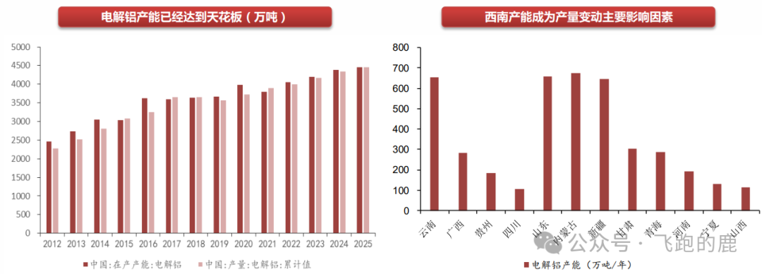 国内电解铝产能已触及 4500 万吨的上限,产量波动主要受西南地区水电供应影响。