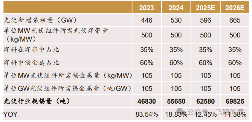 光伏领域同样带动锡需求。1 兆瓦光伏组件需要锡金属约 105 千克,ITA 数据显示,1 兆瓦光伏电池所需光伏焊带约 500 千克,其中焊料占焊带重量的 35%,且主流焊料中锡占比约 60%。2025 年光伏行业用锡量将达到 6.3 万吨,2026 年增至 7.0 万吨,成为锡需求的重要增长点。
