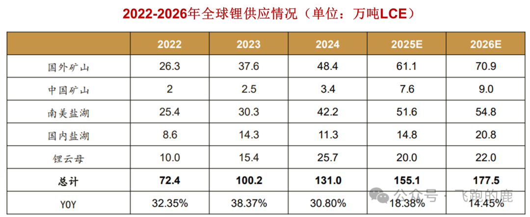 2024 至 2026 年,锂供给折合碳酸锂当量分别为 131.0 万吨、155.1 万吨、177.5 万吨,同比增速依次为 30.8%、18.4%、14.4%。各来源供应增速方面,国外澳洲与非洲矿山 2024 至 2026 年分别为 28.7%、26.2%、16.0%;