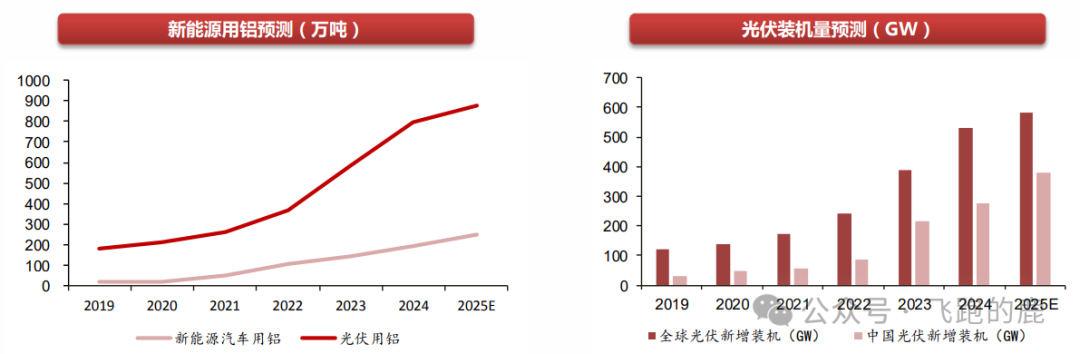 按照 2025 年全球光伏新增装机 583GW、国内新能源汽车产量增速 30%、单车用铝 150kg 测算,当年新能源领域铝消费占比将提升至 24%。
