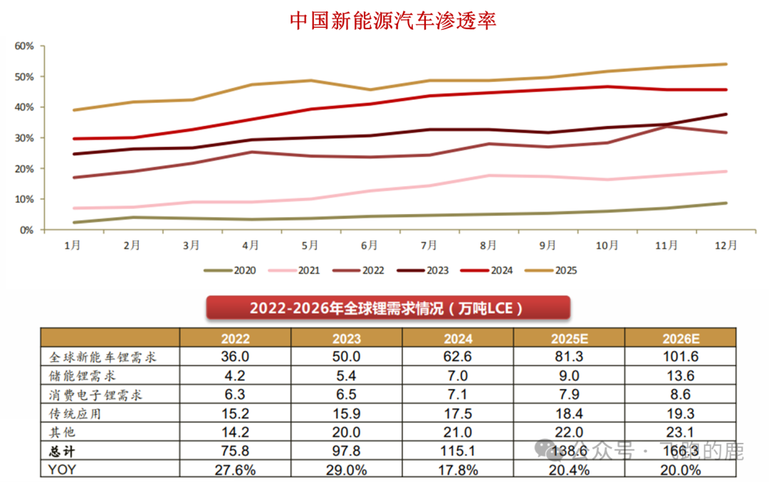 新能源汽车与储能行业快速发展,2025 年中国新能源汽车零售渗透率达 53.9%。2026 年,在以旧换新政策与半固态电池商业化的推动下,新能源汽车发展有望持续提速,如果储能、消费电子领域锂需求增速分别为 50%、10%。据此预计,2026 年全球锂需求总量将达到 166.3 万吨碳酸锂当量,同比增长 20%。