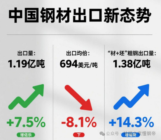 2025年,中国钢材出口量再创新高——1.19亿吨,同比增长7.5%。但鲜有人注意到,出口均价却同比下降8.1%,每吨仅694美元。更令人警觉的是,“材+坯”折合粗钢出口高达1.38亿吨,增幅达14.3%。量在涨,钱却没进账,这背后隐藏着一个灰色产业链:钢材“买单出口”。