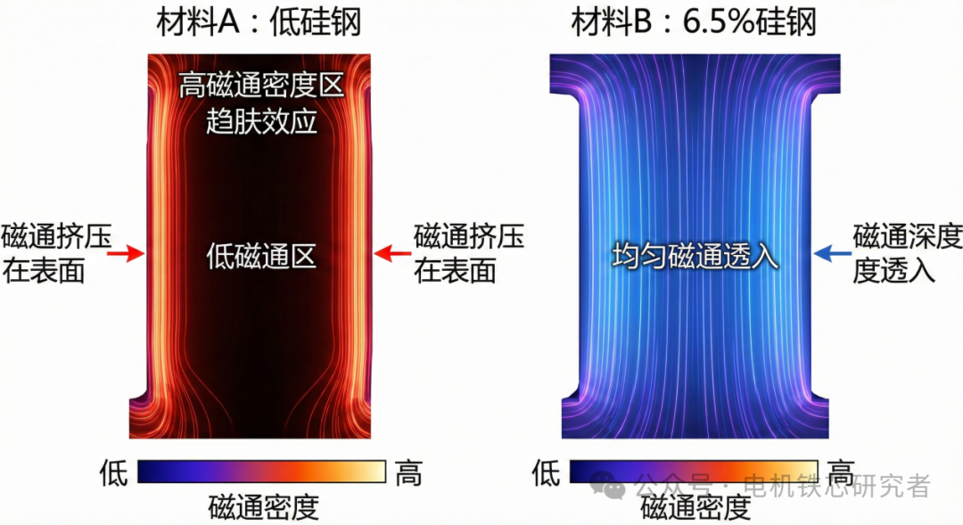 要探索6.5%的奥妙,首先要问个问题:我们为什么要往纯净的铁里掺杂硅? 纯铁(Fe)拥有极好的导磁性,是磁力线的天然高速公路。但它有一个致命的缺陷——导电性太好了。在交变磁场中,良好的导电性意味着感应电流(涡流)可以像洪水一样在铁芯内部肆虐。 根据涡流损耗公式Pe∝f2/ρ(其中ρ为电阻率),电阻率越低,损耗就越大。如果不加干预,电机还没转起来,铁芯产生的热量就能把绝缘漆烤化。 1900年,英国冶金学家哈德菲尔德发现,向铁中加入硅(Si),可以产生奇效。硅原子进入铁的晶格后,会导致晶格发生微观畸变。这种畸变就像是在电子流动的道路上撒满了“路障”,极大地增加了电子散射,从而显著提高电阻率。 l纯铁:电阻率约10μΩ·cm l3%硅钢:电阻率提升至45μΩ·cm l6.5%硅钢:电阻率飙升至82μΩ·cm 仅从抑制发热的角度看,硅似乎是加得越多越好。然而,大自然从不给免费的午餐。 图1:电子流动的微观对比 注:纯铁导电性太好,在交变磁场中会产生像洪水一样的感应电流(涡流),导致严重发热。向铁中加入硅原子,会引起晶格微观畸变,就像在电子流动的道路上撒满了“路障”,极大地增加了电子散射,从而显著提高电阻率,抑制涡流损耗。 科学家们在实验中发现,当铁硅合金中的硅含量缓慢增加到6.5%(重量百分比)这个特定数值时,材料的物理属性发生了一次“质的飞跃”,仿佛触碰到了某个神秘的开关。 这一现象被称为“6.5%奇点”,主要体现在以下三个方面: 这是6.5%硅钢最核心、最不可替代的特性。 然而,在6.5%硅含量处,铁硅合金的饱和磁致伸缩系数惊人地降到了0! 这意味着,无论磁场如何剧烈波动,铁芯体积纹丝不动。对于潜艇声呐、核磁共振(MRI)环境下的电机、以及对精度要求苛刻的光刻机工件台,这种“零磁致伸缩”是唯一的选择。 图2:6.5%奇点的“零磁致伸缩”效应 注:电机噪音本质上源于磁致伸缩效应,即铁芯在磁场下尺寸发生伸缩变化拍打空气。在6.5%硅含量这个特定的物理学奇点,铁硅合金的饱和磁致伸缩系数惊人地降到了0。 常说6.5%硅钢“没有脾气”,指的就是它的磁晶各向异性常数(K1)在此浓度下趋近于零。 简单来说,磁力线在晶体内部“转弯”不需要消耗能量,不再受晶格方向的束缚。这种近乎为零的各向异性,赋予了材料极高的最大磁导率(μmax)。这意味着只需要极小的励磁电流,就能唤醒沉睡的磁场。 综合了高电阻率(低涡流损耗)和低磁晶各向异性(低磁滞损耗),6.5%硅钢在高频下的总损耗表现是碾压级的。 在10kHz以上的频段,其损耗甚至可以媲美非晶合金,但它同时又保留了非晶合金所不具备的高饱和磁感应强度(Bs≈1.8T vs 非晶的1.5T) 综上所述,6.5%是物理学在电阻率、磁致伸缩、磁导率三者之间找到的唯一完美平衡点。 既然6.5%性能如此优越,按照工程思维,是不是做到7%、8%会更好?毕竟电阻率还会更高。 答案是否定的。因为一旦越过6.5%这条线,材料力学性能将面临“毁灭性崩塌”。 在低硅含量(<3.5%)下,硅原子在铁晶格中是随机分布的(固溶体),这时候金属还保留着韧性,可以冷轧成薄板。 然而,当硅含量接近并超过6.5%时,硅原子开始“搞小团体”,它们不再随机分布,而是倾向于形成一种极其规则、死板的排列结构,学术上称为“有序相”(主要是B2相和DO3相) 图3:从韧性到脆性的微观转变 注:一旦硅含量越过6.5%,材料力学性能将面临“毁灭性崩塌”。因为硅原子开始形成死板的“有序相”结构,把原本柔韧的金属晶格锁死,使得材料在室温下的延伸率直接降为0%,像玻璃一样脆,无法加工。 这种有序结构就像是把原本柔韧的金属晶格锁死了一样。 l位错钉扎:金属的变形依赖于“位错”的滑移,而有序相就像在滑移面上打满了钉子。 l极度脆性:当硅含量达到7%时,材料在室温下的延伸率直接降为0%。 0%延伸率意味着什么? 意味着它像玻璃或饼干一样脆。你不能冲压它,模具一压下去,材料不是发生塑性剪切,而是直接粉碎性崩裂;甚至如果不小心把钢板掉在地上,它都会碎成一地渣。 所以,不能更多,是因为我们造不出来,也加工不了。6.5%是人类在保持材料拥有“最低限度可加工性”的前提下,所能触碰的极限天花板。 如果6.5%加工太难,那我们退一步,用4.5%或5.5%的中高硅钢行不行? 当然可以,实际上市场上也有此类产品。但在高端应用中,差这1%就是“质”的差别。 随着新能源电机转速向20,000rpm甚至更高进军,驱动频率突破1kHz,高次谐波频率突破10kHz。 在高频下,磁通不再均匀流过铁芯截面,而是被挤压到表面,这叫趋肤效应。透入深度与电阻率的平方根成正比。 如果硅含量不够高(电阻率不够大),高频磁通就会被挤在极薄的表层,导致铁芯内部未被利用,且表面发热剧增。6.5%硅钢凭借其超高电阻率,能显著缓解这一效应。 图4:高频下的“趋肤效应”对比 注:如果硅含量不够高,电阻率不足,高频磁通就会挤在表层导致内部未被利用且表面剧烈发热。6.5%硅钢凭借超高电阻率,能显著缓解这一效应。 前文提到6.5%的磁致伸缩是“0”。 5.5%的硅钢虽然磁致伸缩也很小,但它不是0。在追求极致静音(如豪华电动车NVH)和微米级精度控制(如精密机床)的场景下,“很小”和“零”之间存在着无法跨越的体验鸿沟。 因此,不能更少,是因为在顶级的高频与静音指标面前,妥协意味着平庸。 既然6.5%硅钢脆如玻璃,那现在市面上的产品是如何制成的?这主要归功于冶金技