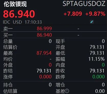 截至发稿,伦敦金现日内大涨5.56%,报4918.34美元/盎司,盘中最高触及4949.99美元/盎司;伦敦银现涨势更为迅猛,日内大涨9.87%,报86.94美元/盎司,最高上探至87.954美元/盎司,涨幅依旧远超黄金。两者均已收复昨日跌幅。