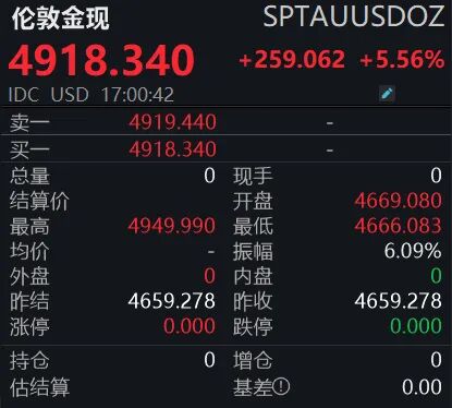 期货市场同步拉升,截至发稿,COMEX黄金期货日内大涨6.53%,报4956.6美元/盎司,盘中最高触及4975.5美元/盎司;COMEX白银期货则上涨13.95%,报87.755美元/盎司,最高触及87.85美元/盎司。