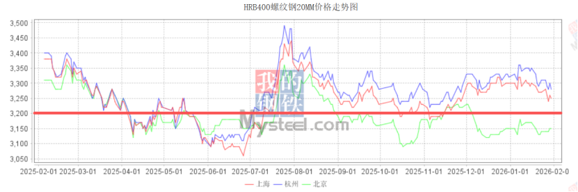 截至2026年2月3日,螺纹钢期货主力合约收于3099元/吨,黄河以北螺纹现货价格跌破3200元大关。