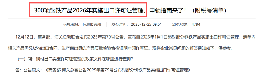 出口回流压力:2026年出口许可证政策或减少1900万吨钢材出口,回流资源冲击国内市场