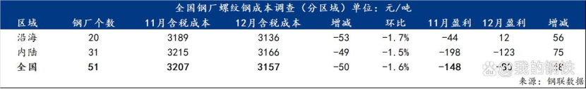 长流程钢厂(用高炉炼铁铁水):江苏地区高炉螺纹钢成本约3185元/吨,加上物流仓储资金等成本,吨钢预计亏损50-100元;