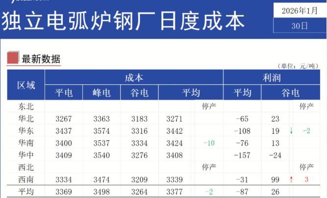 短流程电炉(废钢冶炼):1月30日Mysteel统计76家独立电弧炉建筑钢材钢厂平均成本为3377元/吨,日环比减少2元/吨,平均利润为-87元/吨,谷电利润为26元/吨,日环比持稳。